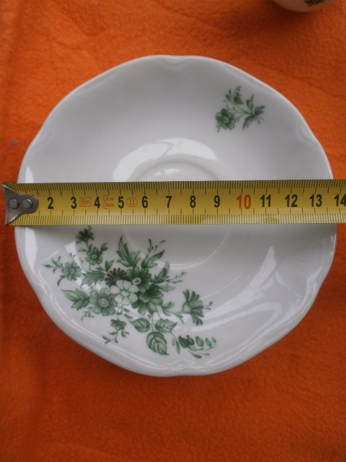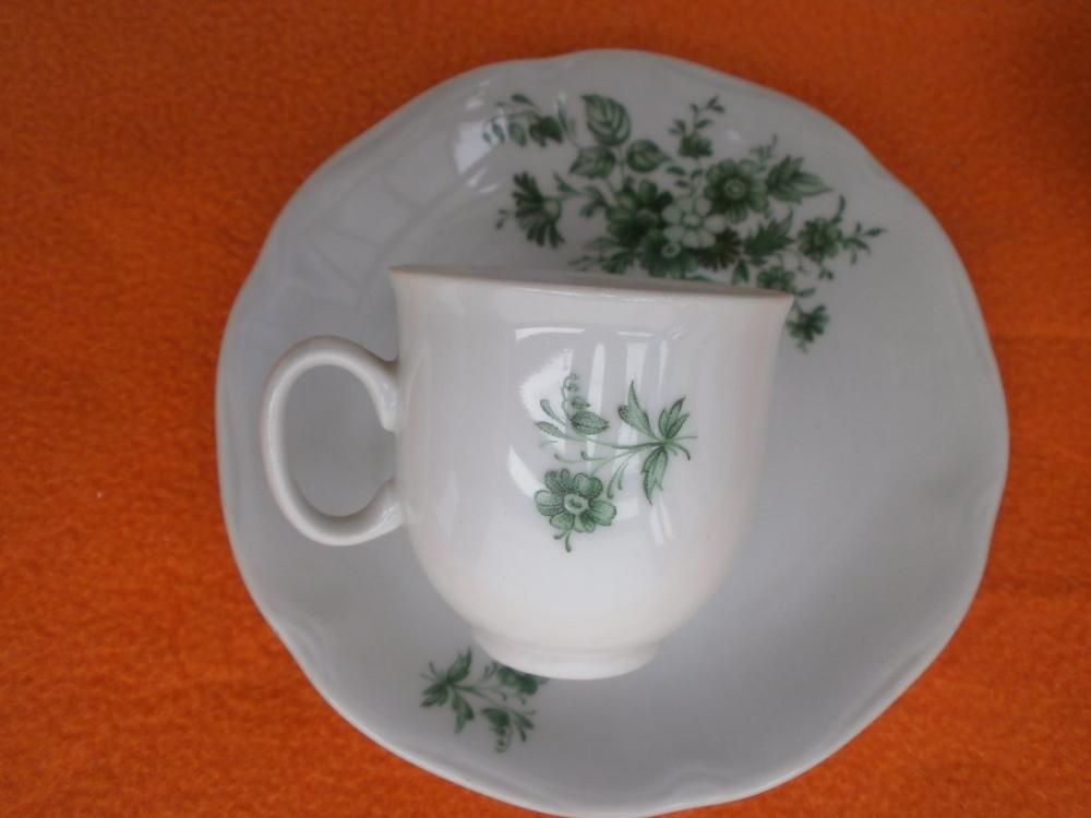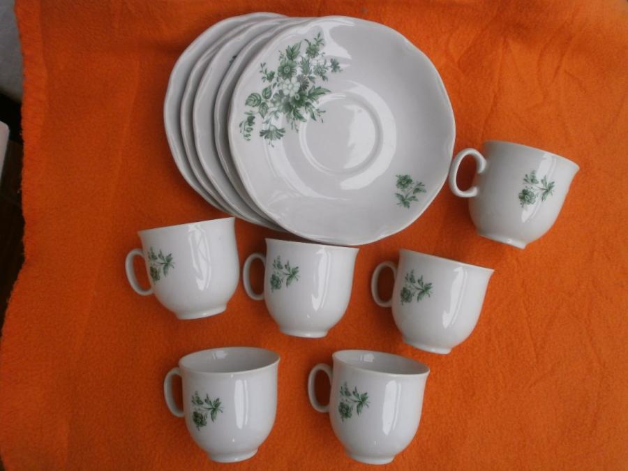 6 hrnků + 6 podšálků, bílý porcelán + drobný zelený květinový vzor. Made in Czechoslovakia, LOUČKY - vyrobeno asi v r. 1970. Na fotografii je pouze pět podšálků, ale je jich šest. Objem hrnku je 110 ml, výška 6 cm, průměr nahoře 6 cm. Průměr talířku 14,2 cm. Souprava byla téměř nepoužívaná, je jako nová - cena 70 Kč za jeden kus, tj. celkem 420 Kč. Vhodné jako dárek, v Praze v dosahu městské dopravy dovezu.