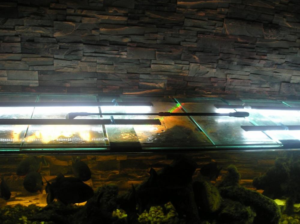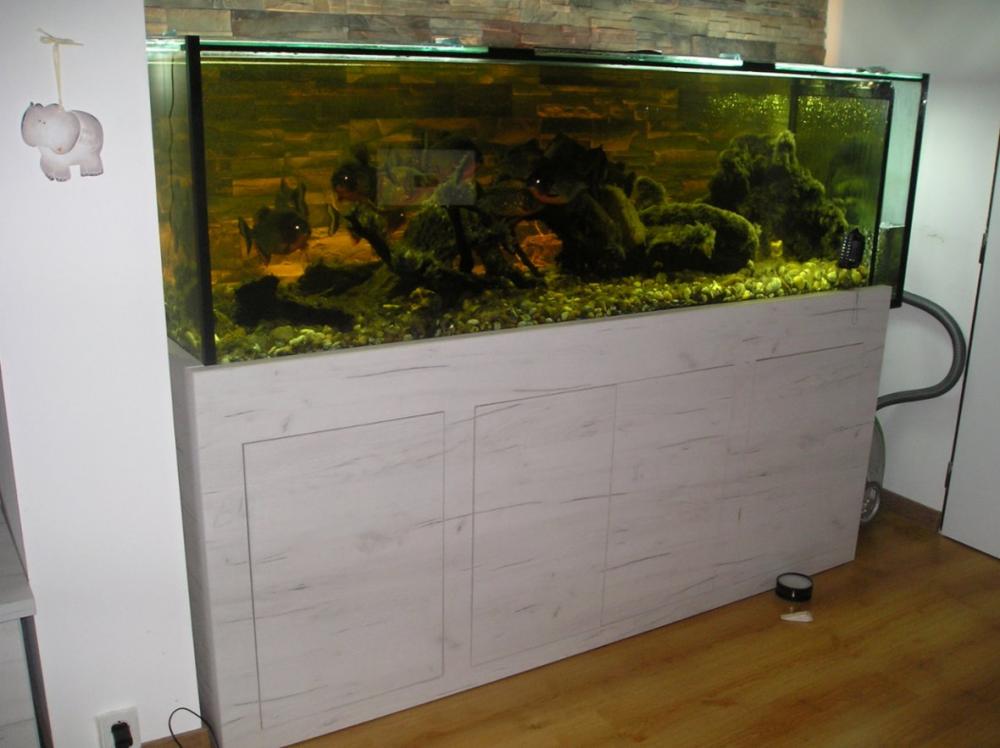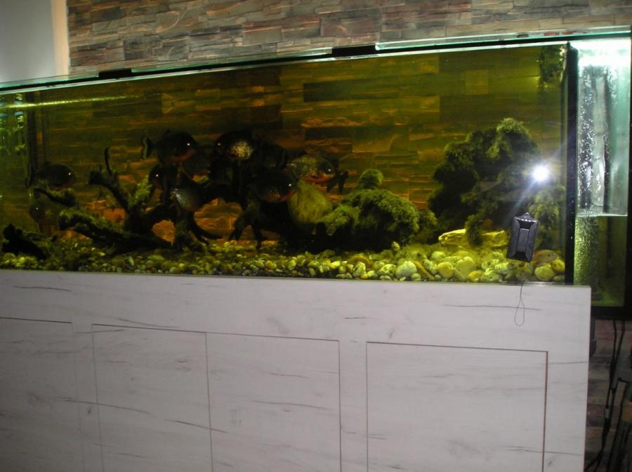 Komplet zařízené akvárium viz foto o rozměrech dxvxh 215x70x65cm, externí filtr, 4x osvětlení Sencor, topítko 300W, čerpadlo jebao 3500l/hod., 12 ks piraně dravá.