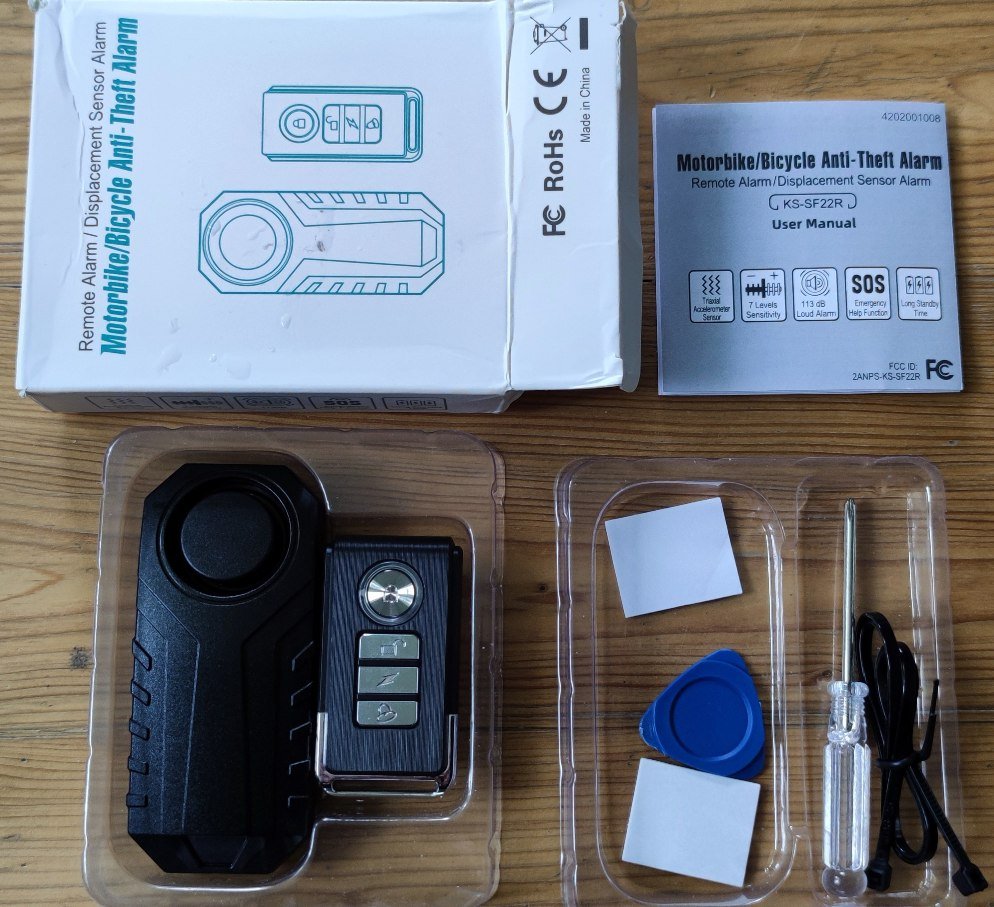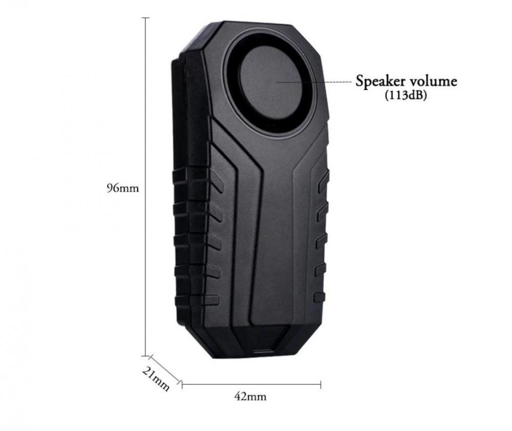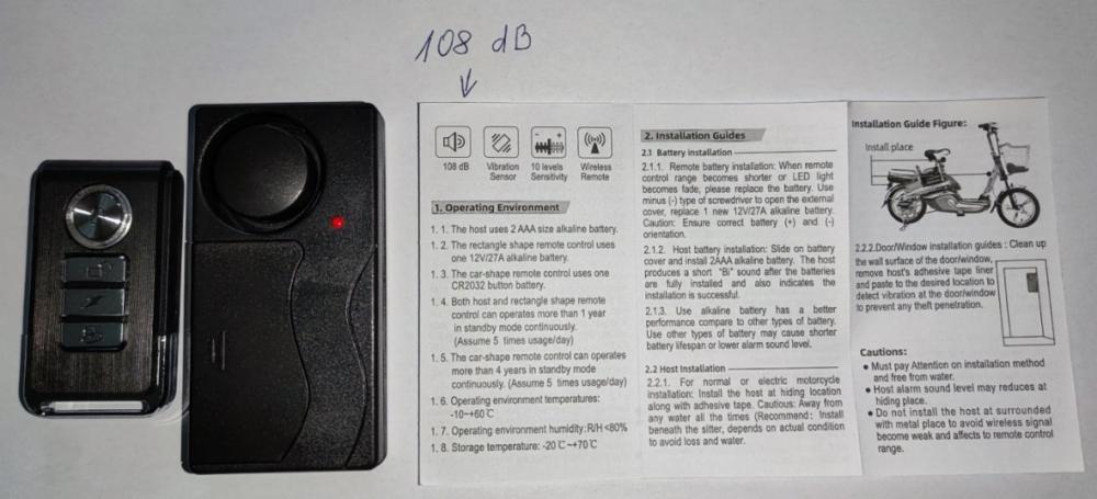 Alarm 108-113 dB lze připevnit stahovací páskou na kolo, koloběžku, motorku, nebo jiný dopravní prostředek, nebo také do batohu, či cyklistické taštičky apod. Nastavitelná citlivost, zvuk. Funkce SOS. IP 55 voděodolný, prachotěsný. Alarm má dálkové ovládání. Baterie AAA, CR2032. Manuál. Alarm není potřeba montovat na rám kola, stačí hodit do brašny, kolo opřít a v klidovém, ustáleném stavu odpípnout (potvrdit) spínacím tlačítkem a hotovo. 113 dB je opravdu slušný kravál.