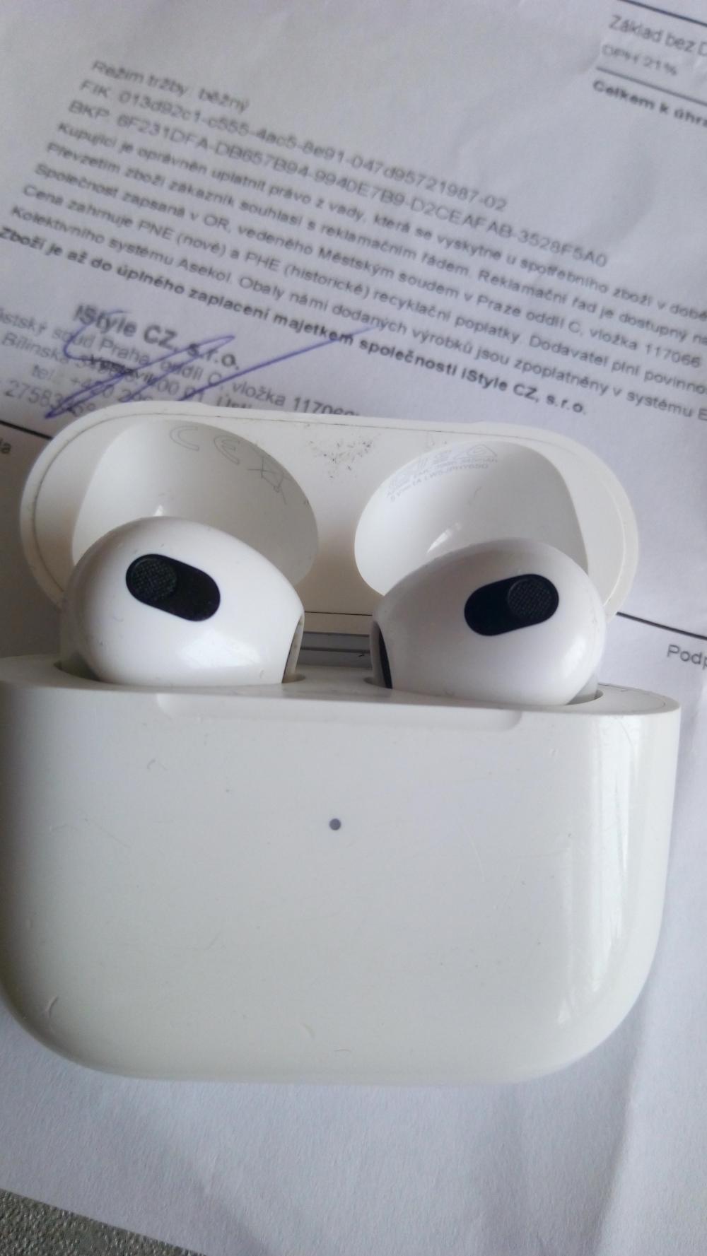 Apple AirPods 3 gen, rok stará, vyčištěna, doklad o zaplacení, sluchátka jsou originál včetně USB