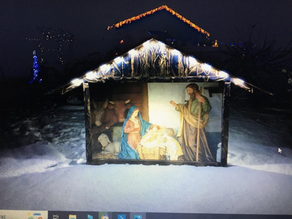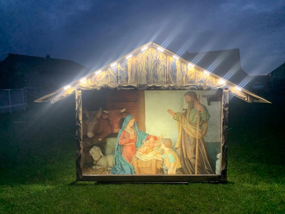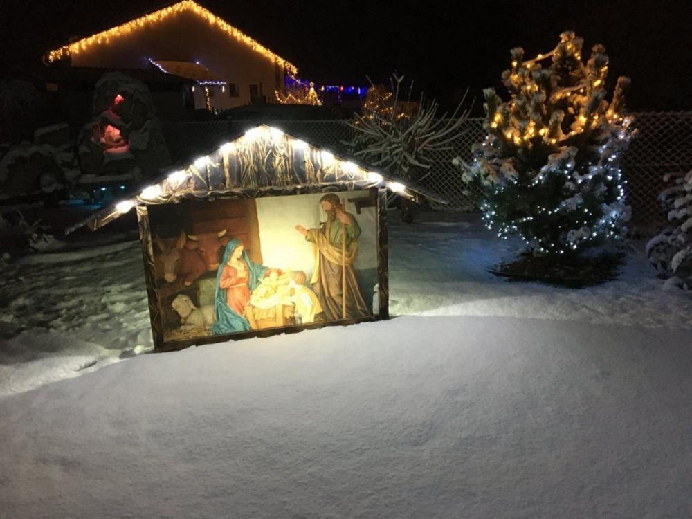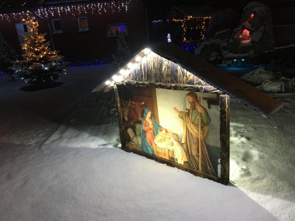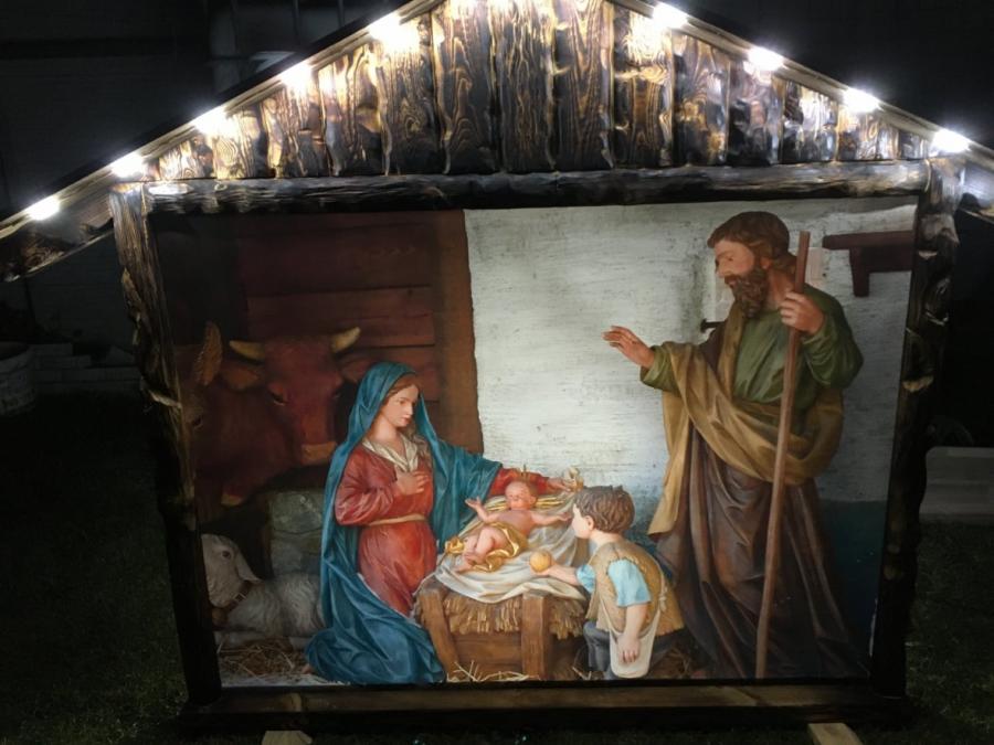 Betlém určený jako venkovní dekorace. Rozměry: výška 145 cm, šířka 254 cm osvětlení LED.