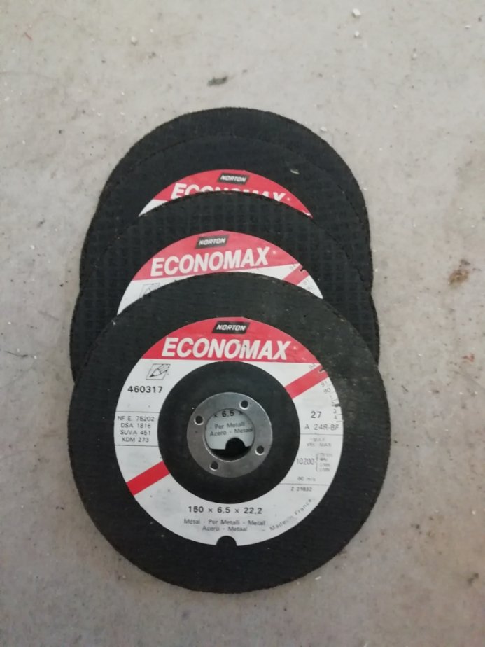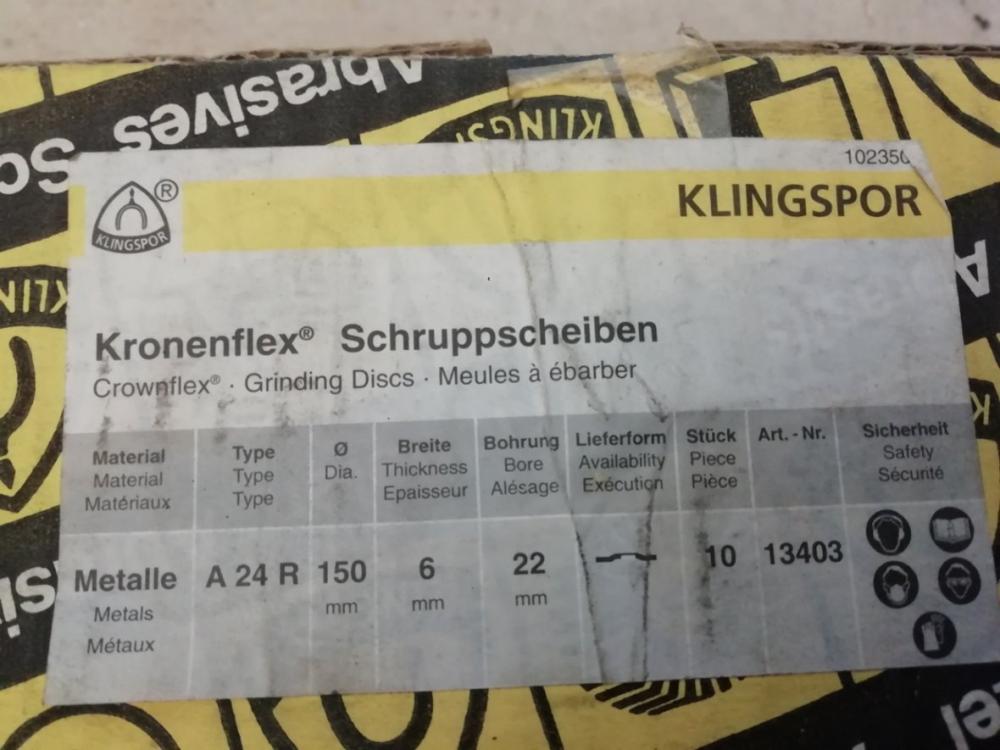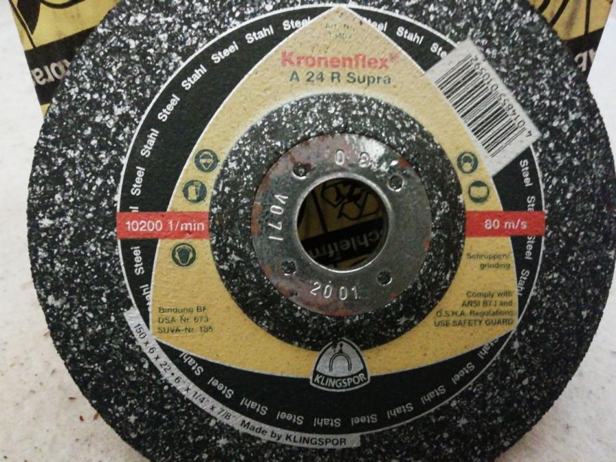 Brusné kotouče na železo - 4x kotouč Norton Economax 150 x 6,5 x 22,2mm. 10x kotouč Klingspor Kronenflex 150 x 6 x 22,2mm. Cena 25 Kč/kus.