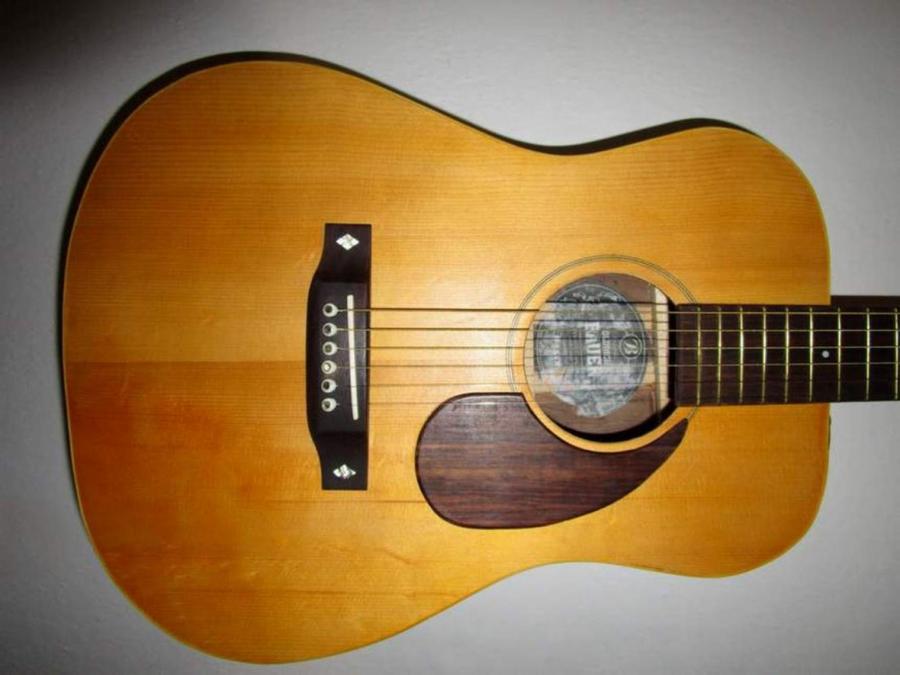 Cestovní malou kytaru viz foto (ručně vyrobená na zakázku v roce 2018 v kytarové dílně), celk. d. 95cm. Přední deska masivní alpský smrk, zadní deska ořech, krk javor, hmatník – slza palisandr, nultý pražec podložka do kobylky, kolíčky v kobylce bůvolí kosti. Perleťová výzdoba kobylky a kolíčků a pražce viz foto. Nultý pražec 44mm. Na kytaře jsou 10 struny nové dávané v září 2022. Kytara má dobrý zvuk, vhodná jako cestovní kytara, nebo pro začátečníka. Rychlé jednání pouzdro z černé. 5.000 Kč.