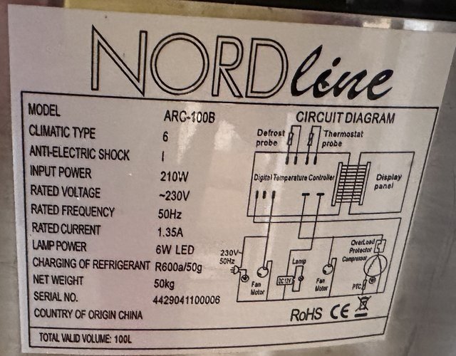Chladicí vitrína - katalogové číslo: 15895 . Typ, parametry: ARC 100B . Výrobce: NORDline . Stolní pultová vitrína v nerezovo-černém provedení vhodná pro vystavení zákusků, dortů, sendvičů nebo chlebíčků. Vybavena izolačními skly, samozavíracími dveřmi a LED zářivkami, které jsou umístěny ze dvou stran. Vlastnosti: ventilované chlazení , vestavěný agregát , chladivo R600a , automatické odtávání , digitální termostat , všechna skla dvojitá 3 nastavitelné skleněné police - průměr 39 cm.