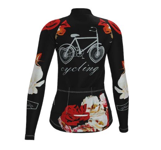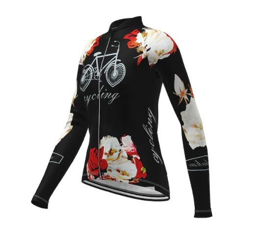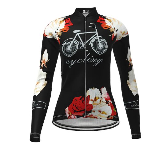 Dámský cyklistický dres s dlouhým rukávem zn. Ilpaladino. Barva černá s cyklistickými a botanickými motivy. Elastický, prodyšný, rychleschnoucí, antibakteriální. Odolný vůči UV záření. Velikost "XS". Originální design, zcela nové, nenošené. Cena 500 Kč.