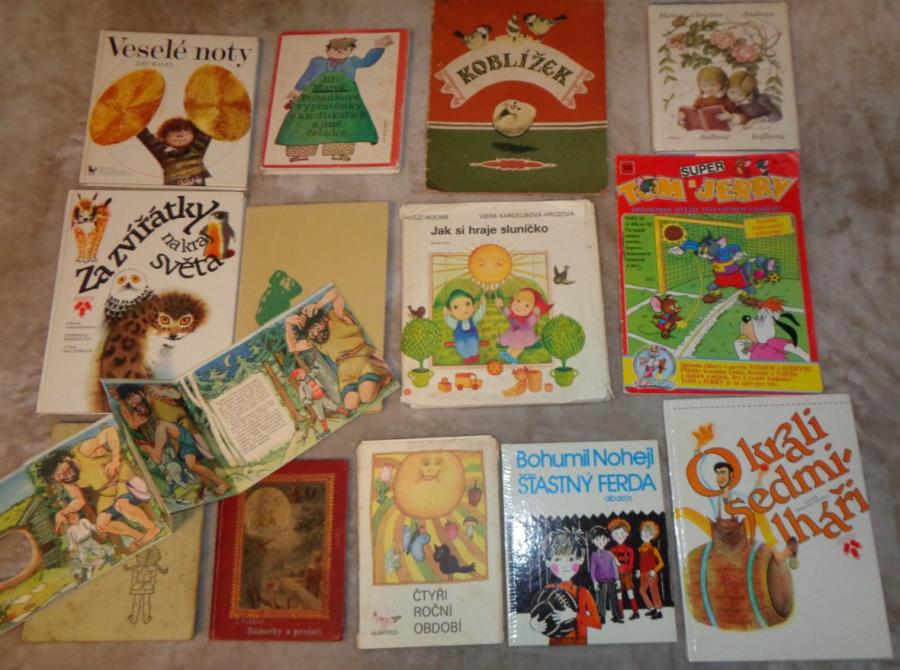 Knihy pro děti: O králi sedmilháři od J. Tafela, Veselé noty od J. Havla, Za zvířátky na kraj světa, Báchorky a pověsti od Ž. Podlipské, Čtyři roční období od H. Vrbové- skládačka, Jak si hraje sluníčko od A. Nociara, příběhy Tom a Jerry, Říkali mu uličník od D. Šajnera, Koblížek od A. N. Tolstého, Pohádkové vyprávěnky o knoflíkářích a jiné čeládce od J. Marka, O letadélku káněti od B. Říhy, Šťastný Ferda od B. Nohejla a Sněhová královna od H.Ch. Andersena, celkem 13 knih za 450 Kč + přepravné.