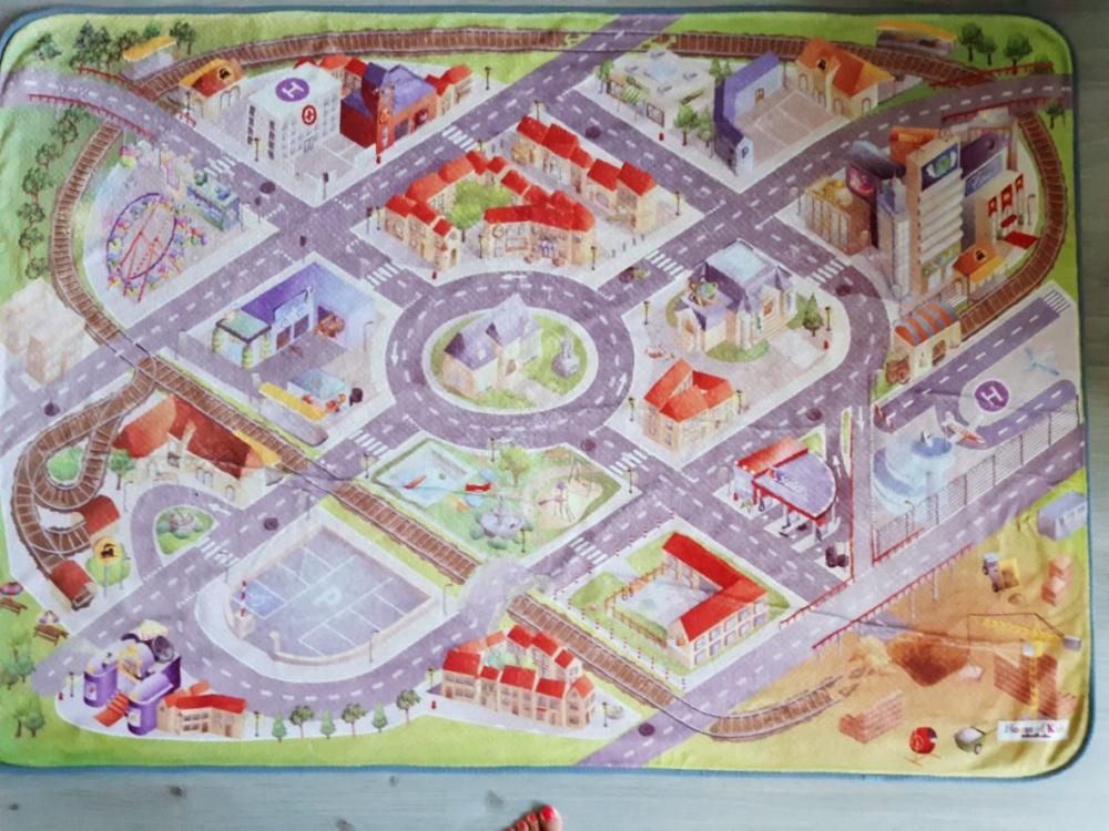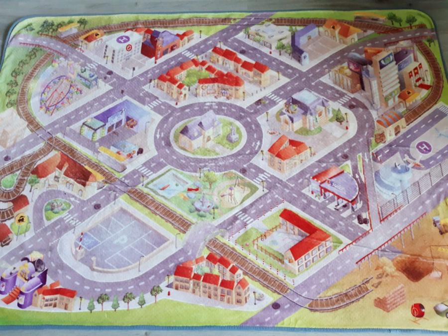 Dětský koberec, velikost 120 x 180, lze jej prát v pračce, motiv město, ulice, letiště, vlak a silnice viz. foto.