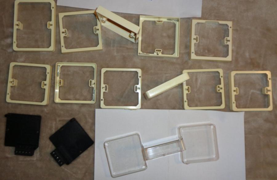 K spínacím hodinám SPH – Q nabízím 2 ks základové destičky, 3 ks průhledné kryty spínaček, pod vypínače nebo zásuvky distanční rámečky hranaté 4 ks, distanční rámečky zaoblené pod vypínač nebo zásuvku 6 ks a 1 ks distanční rámeček zaoblený pod dvojzásuvku, vše nové, po 10 Kč/ks nebo komplet za 150 Kč + přepravné.