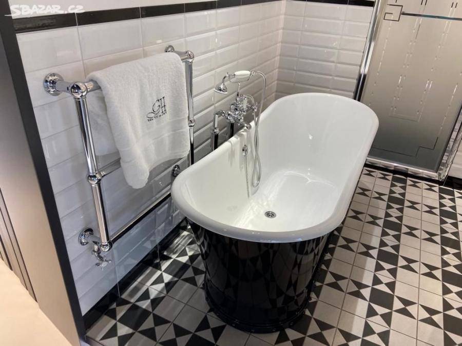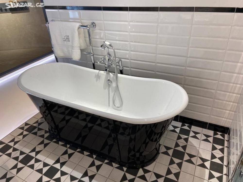 Elite Bath eiffel vana 170 x 68, volně stojící , litinová vana se speciální povrchovou úpravou, vysoký lesk, opláštění - černá ocel . Stav: nová, nepoužitá . Původní cena vč. DPH 251.000 Kč . Příslušenství k vaně: odpad k vaně s řetízkem a přepad - chrom . MyFair vanová podlahová baterie - chrom. 110.000 Kč.