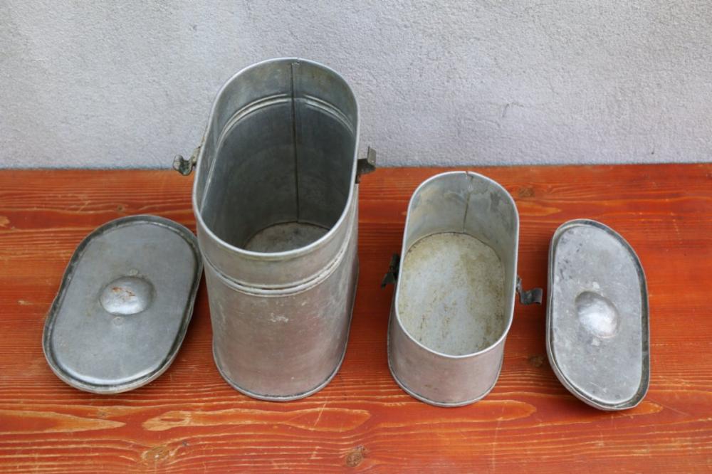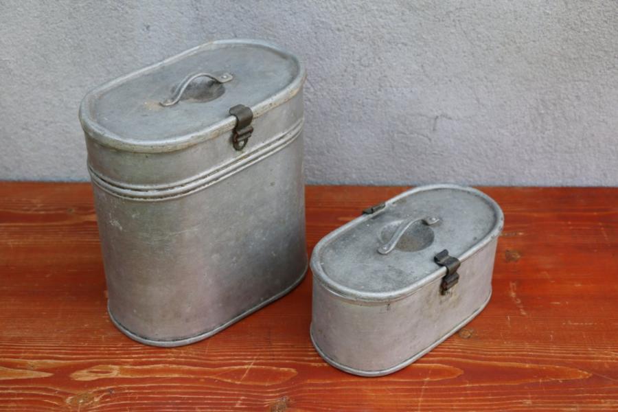 Historický (vojenský) oválný ešus. Vysoký a nízký. Materiál hliník. Cena za celek 300 Kč.