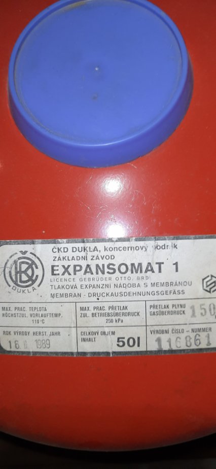 Prodám tlakovou expanzní nádobu s membránou Expansomat 1. Celkový objem 50 litrů, max. pracovní teplota 110 0C, max. pracovní přetlak 250 kPa. Nádoba byla krátce připojena ke kotli na pevná paliva, málo využíváno, proto celý otopný systém demontován; v dobrém stavu. Cena 500 Kč.