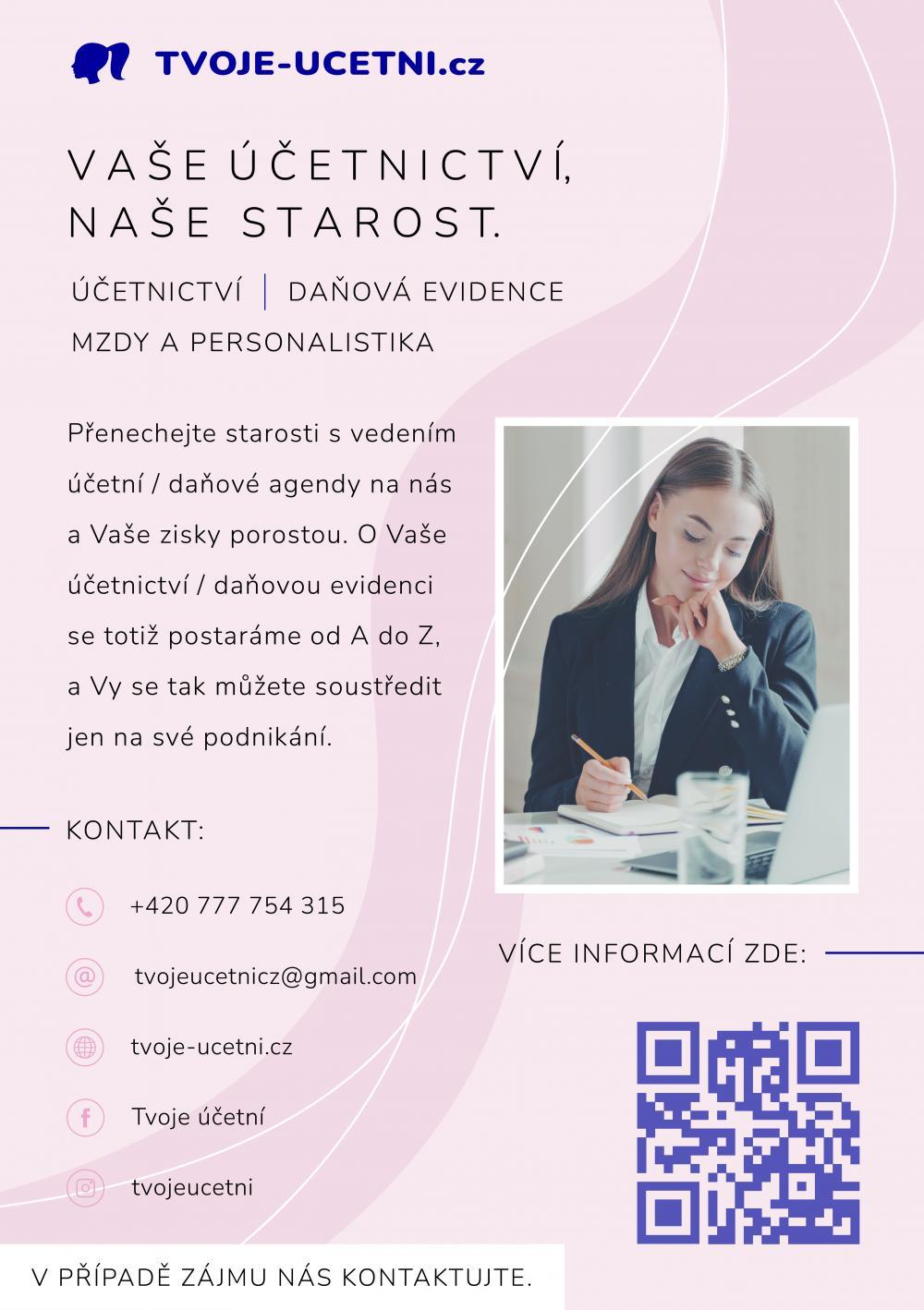 Více informací naleznete na našich webových stránkách: www.tvoje-ucetni.cz, nebo nás kontaktujte na tomto tel. čísle: 777 754 315. Rádi se s Vámi spojíme a probereme možnosti naší případné spolupráce.