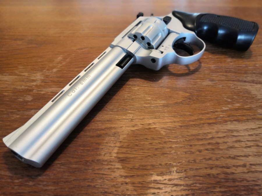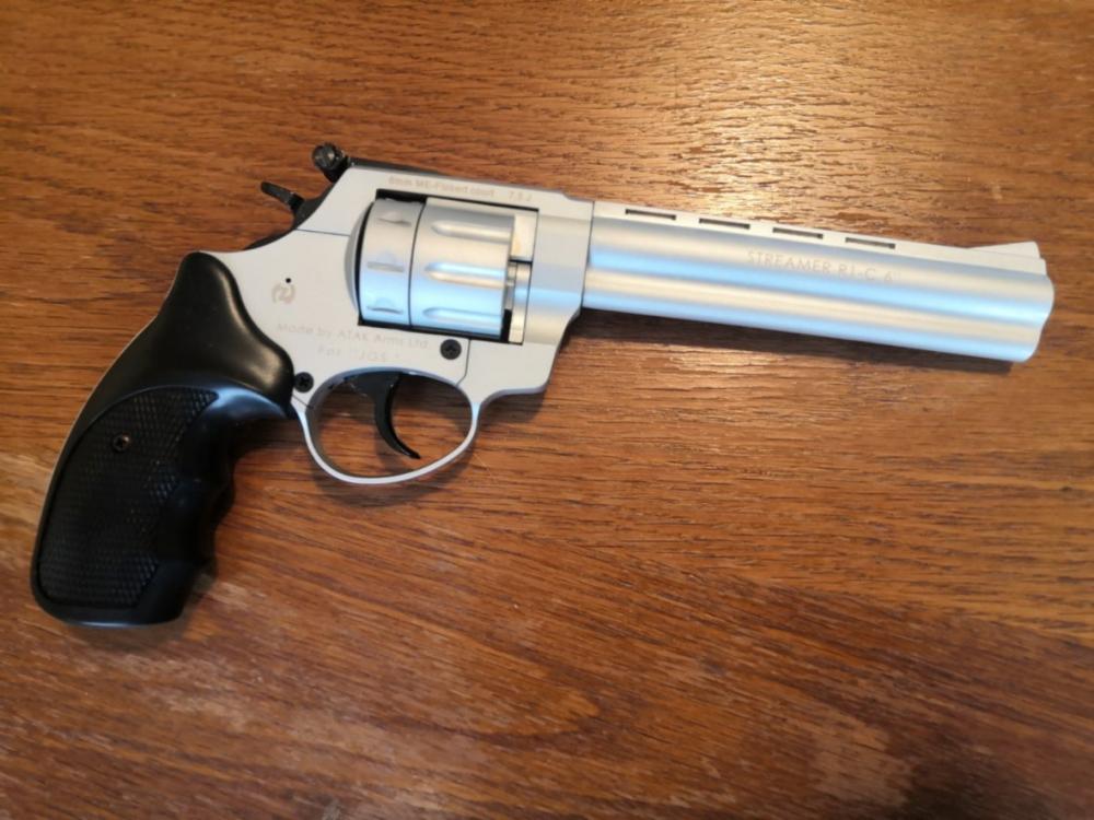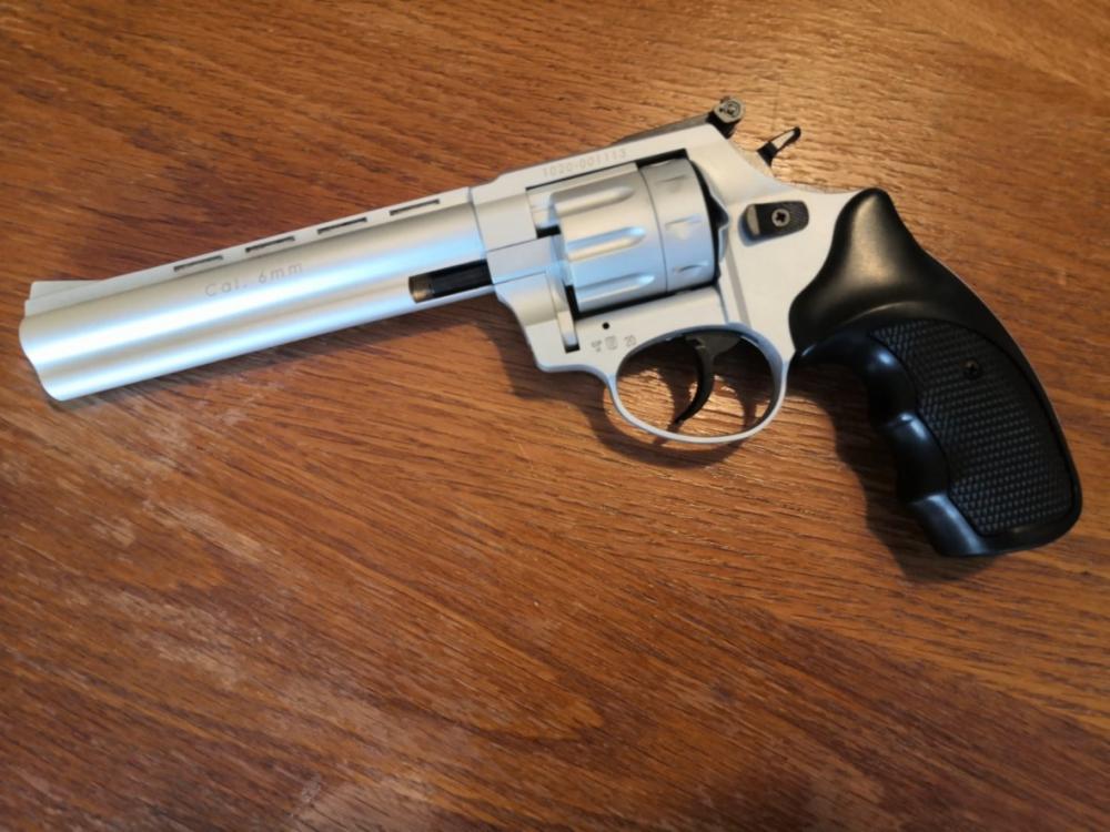 Kategorie D - není třeba registrace na PČR. Nabízím k prodeji velmi pěkný flobertkový revolver v elegantním matném niklovaném provedení. Úplně nový, pouze vyzkoušený, pak byl uložen. Revolver je v ráži 6mm flobert. 6" hlaveň pro přesnou mířenou střelbu. 9ti ranný. Hlaveň je drážkovaná. Volně prodejná zbraň od 18ti let, bez ZP. Kategorie D, není třeba registrace na PČR. Velmi pěkný stav, vše plně funkční. Revolver bude dodán ve vypolstrovaném pouzdru MIL-TEC na zip, viz. foto.