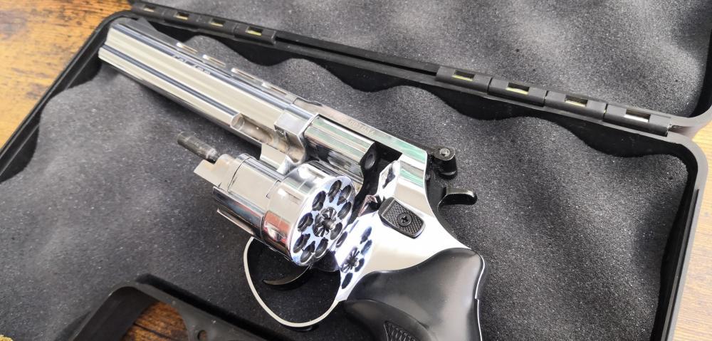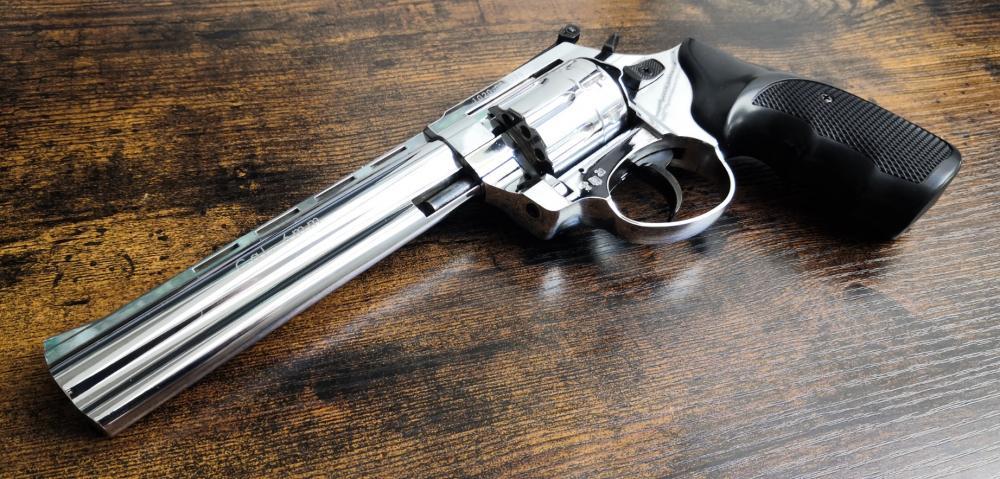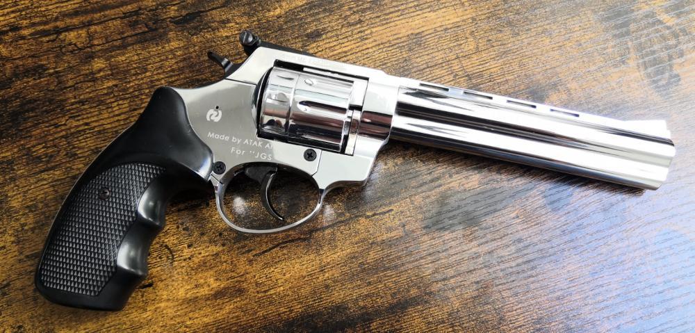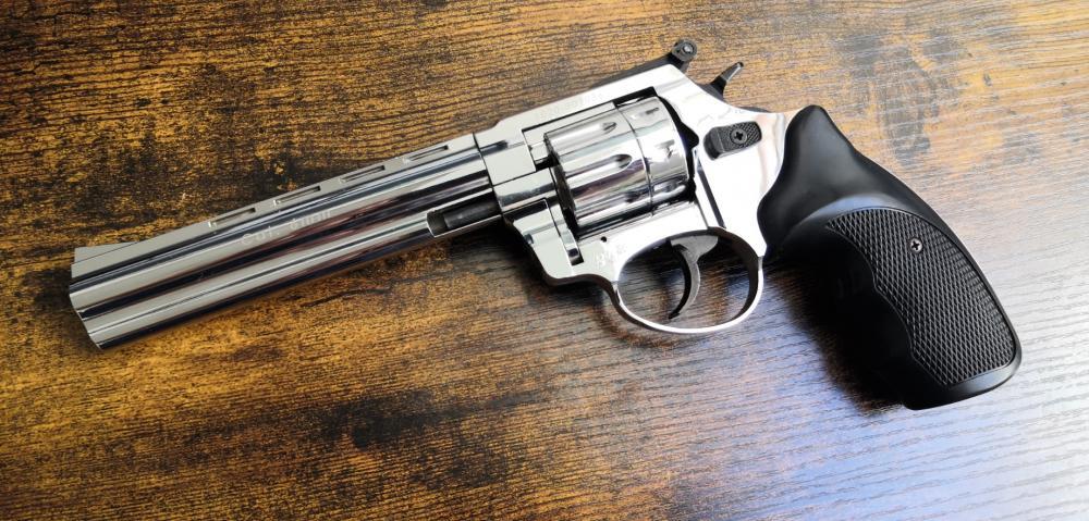 Cal. 6mm Flobert, 9-ti ranný revolver, délka hlavně 6" - hlaveň je drážkovaná pro maximální přesnost, stavitelná mířidla, luxusní chromované provedení.