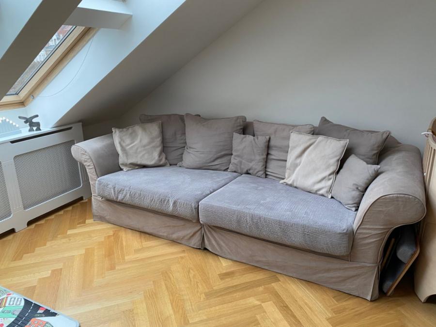 Gauč - béžová barva. Velmi pohodlný, všechny potahy se dají sundat a vyprat. Pro transport je možné rozdělit na dva kusy, takže se gauč vejde do výtahu. Potahy spodních polstaru byly vyměněny. Nove potahy mají mírně odlišnou texturu látky, ale vizuálně to není moc vidět. Viz foto. Jinak velmi pohodlný vzhledem k hloubce sedaku a množství polstaru. Prodáváme, neboť se nám nevejde do nového bytu. Hloubka 112, šířka 266, výška opěrka 70 , sedák hloubka 95 , výška sedák 43cm.
