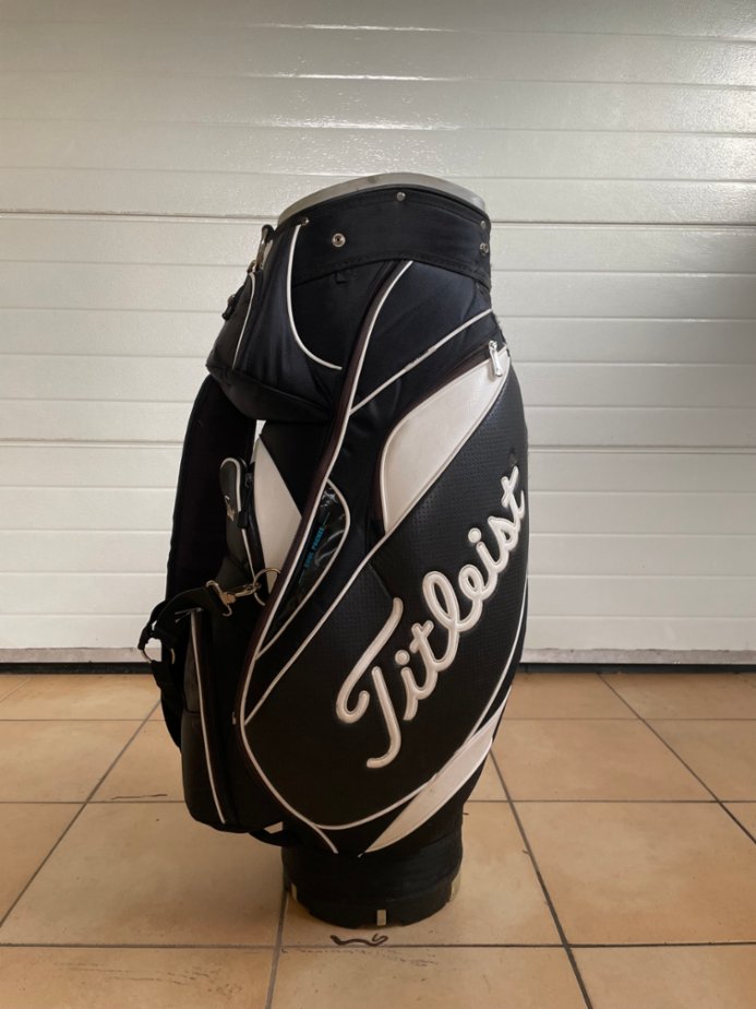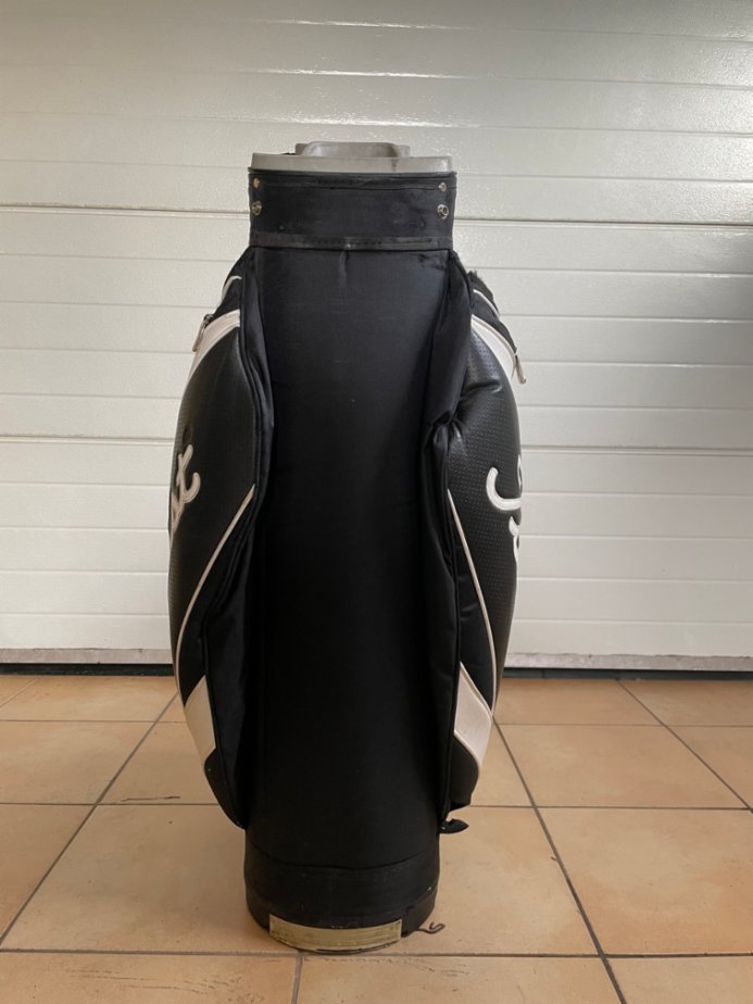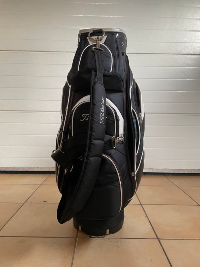 Kvalitní golfový cart bag zn. Titleist. Černobílé provedení, vnitřní pevné plastové stěny, organizér na 14 holí, mnoho kapes, chladicí kapsa na pití, pohodlný popruh na rameno, místo pro deštník, váha 3,6 kg. Bag je používaný ale ve velmi pěkném stavu. Cena 2.300 Kč.