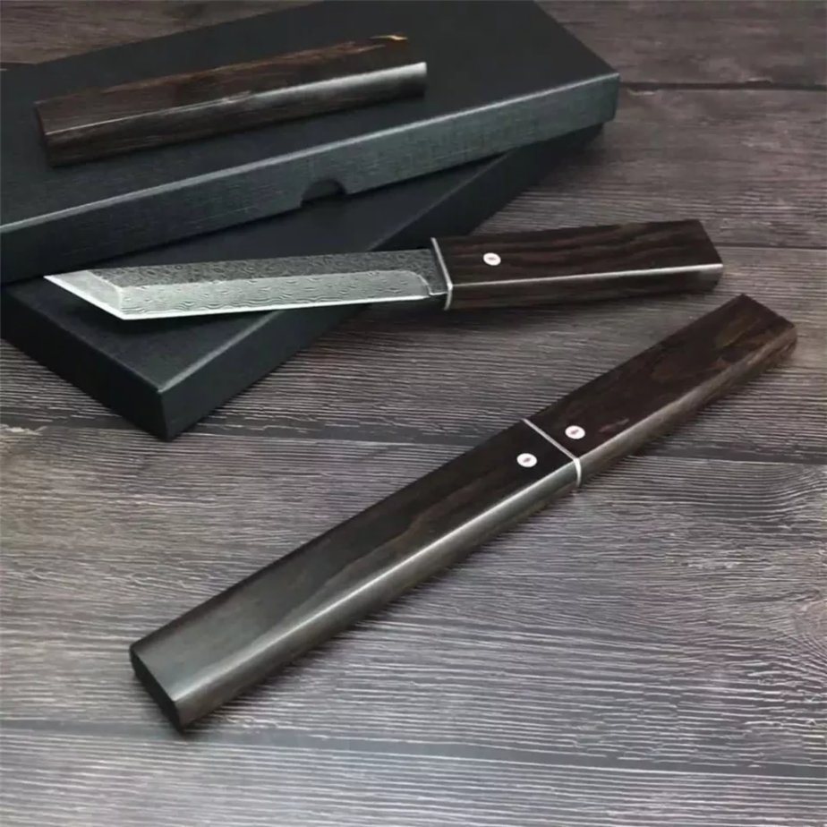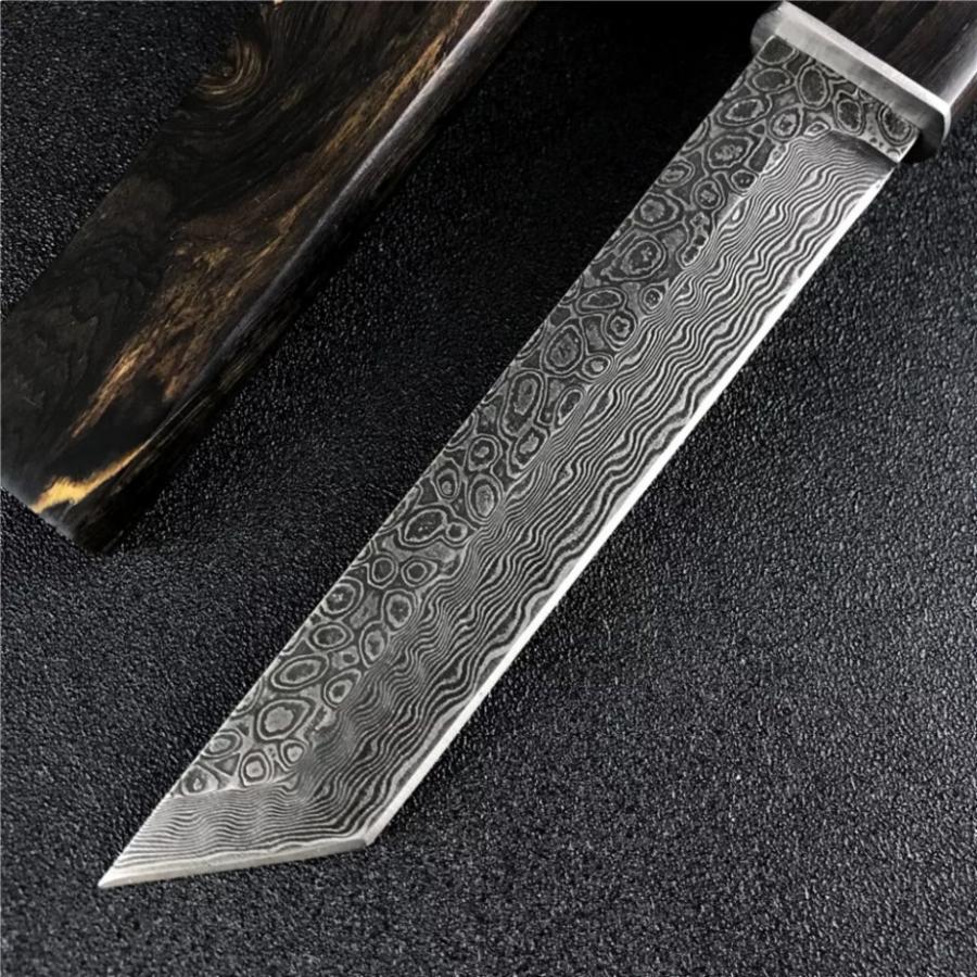Damaškový nůž, ocel je kovaná damašková ocel, rukojeť je vyrobena z ebenu. Nový. Celková délka: 27cm. Délka čepele: 14cm. Tloušťka čepele: 4mm. Šířka čepele: 2,5cm. Ocel: Kovaná damašková ocel VG10, 108 vrstev. Tvrdost: 58-60 HRC. Rukojeť: eben. Pochva: Ebenové dřevo.