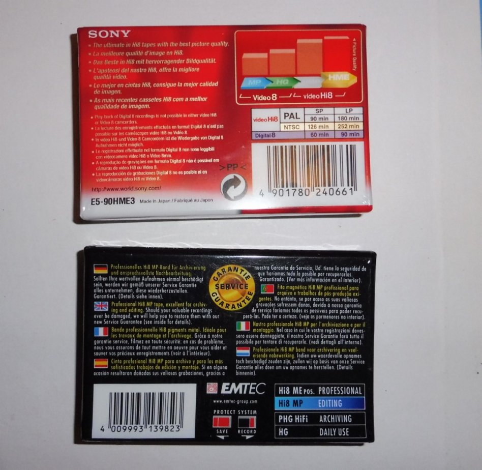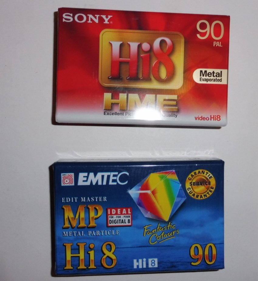 Prodám kazety do kamery Hi8 - Sony HME 90min. 1ks/Emtec MP 90min. 1ks. kazety jsou nové v originálním obalu. Pouze osobní odběr na Praze 2. 200 Kč.