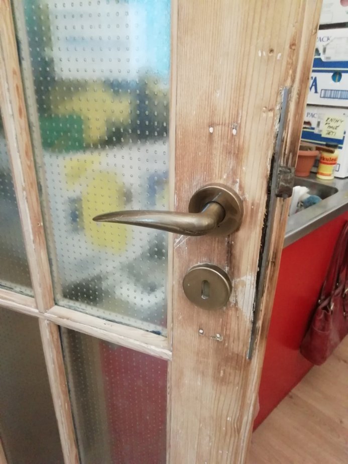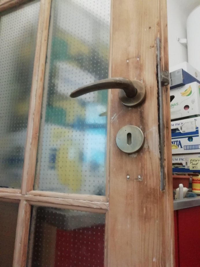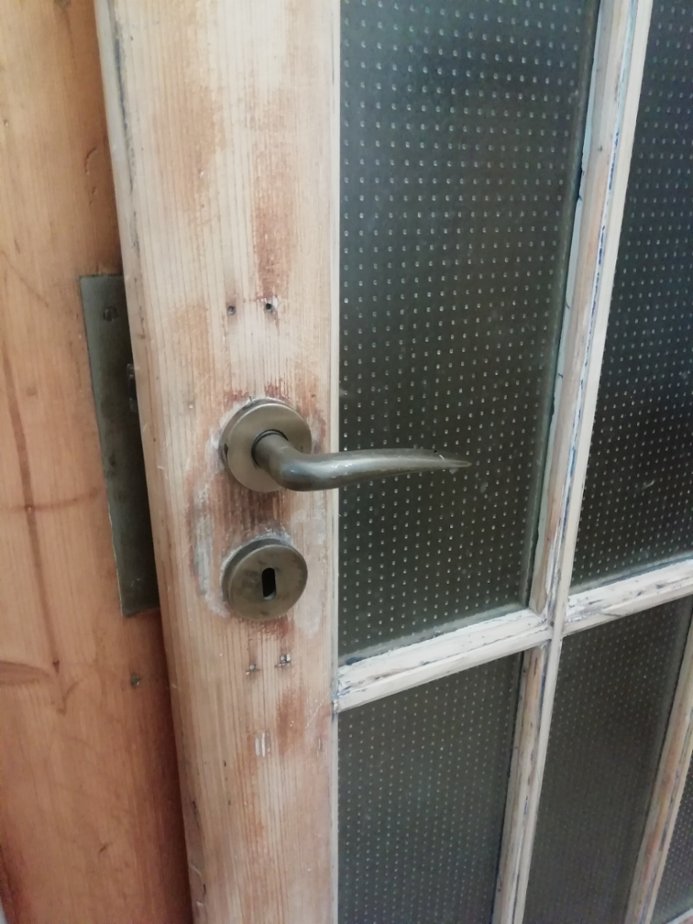 Klika na dveře, dělené rozetové kování, kovová klika, barva tmavá mosaz. 100 Kč.