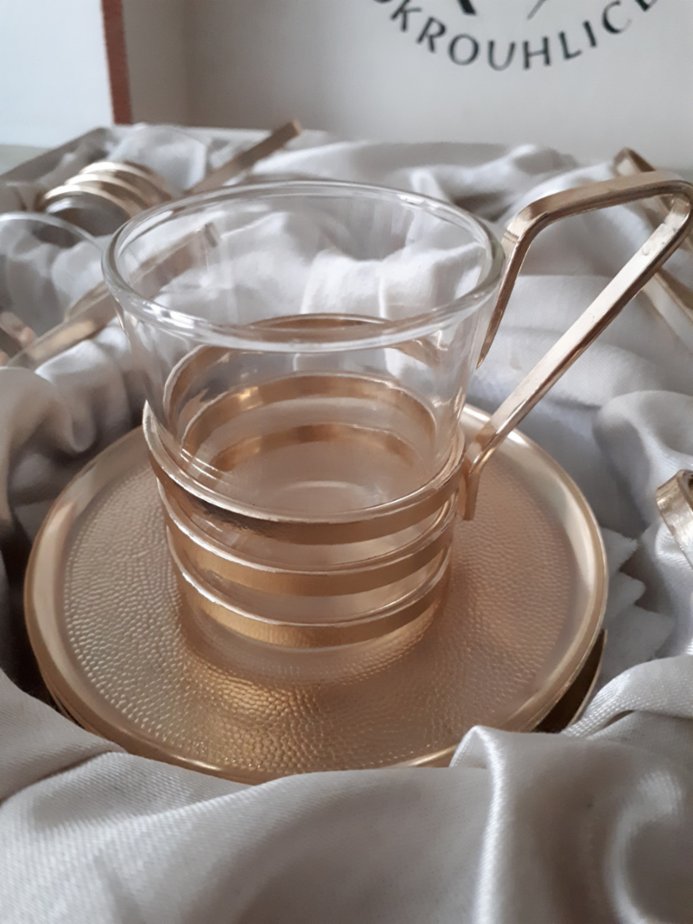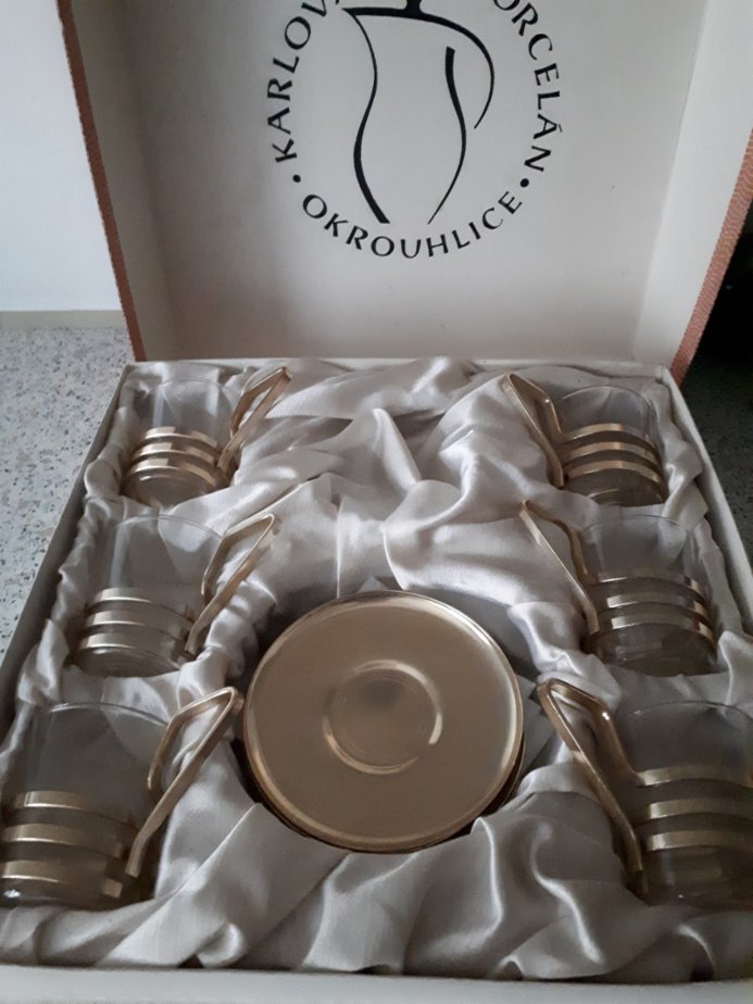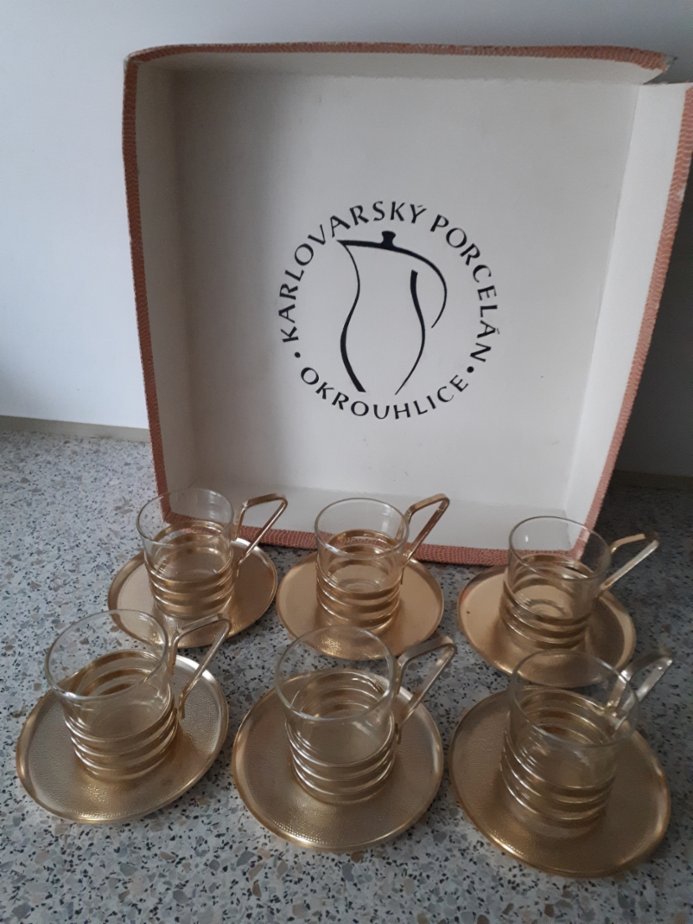 Skleněná kávová souprava, nikdy nepoužitá, kompletní v originální krabici (ta je trochu potrhaná). Karlovarské sklo.
