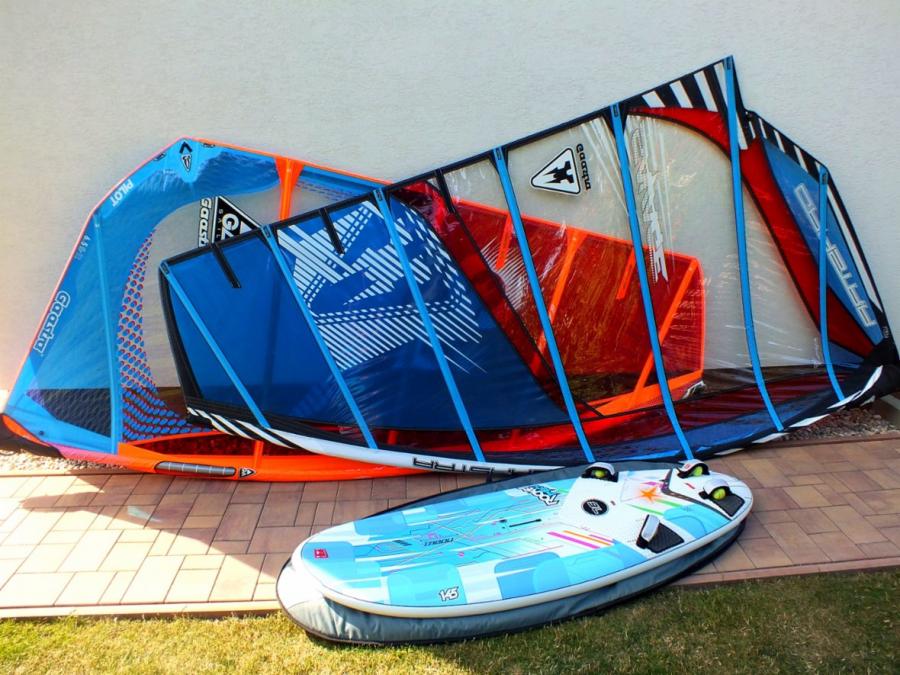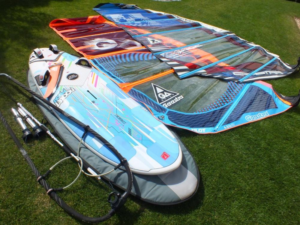 Kompletní windsurfingové vybavení: Freeride board, široký kompaktní plovák vhodný od rodinného užívání na naše vnitrozemní vody díky jeho stabilitě, až po sportovnější svezení, díky 2 kompletním oplachtěním (2x plachta 6,0 a 7,5m2, 2x karbonový stěžeň 430 a 460 příslušných parametrů k dané plachtě 60%karbon!, 2x nástavec s patou) na jedno teleskopické mo nocoque ráhno s úvazky a lanem. Vše si na místě ukážeme a sestavíme, pokud máte doma i menšího surfera mohu přidat plachty 3,5-5,0m2...