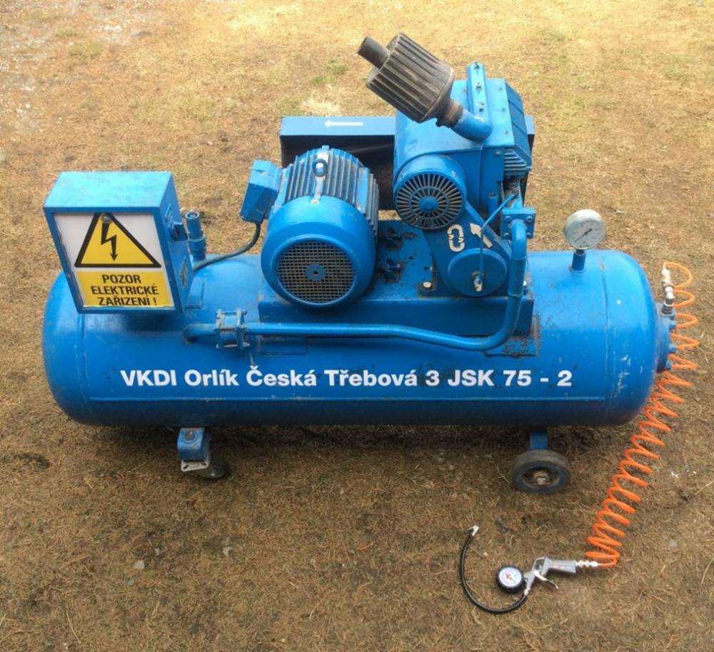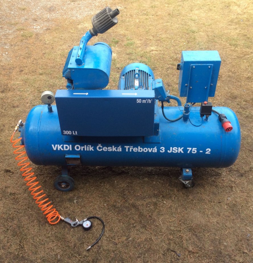 Kompresor Orlík 3 JSK 75-2 (3válec), nádrž 300litrů, výkon 50m3/h, el. motor 7,5kw, nový spínací ventil, el. zásuvka, přední rejdová kolečka, spodní odkalovací kohout, kompresorový olej, vzduchová hadice, koleno, 2x redukce, rychlospojka, nanometr, ofukovací pistole + příslušenství, nový rezervní stop ventil, kontrolní ventil s redukcí, řemen.