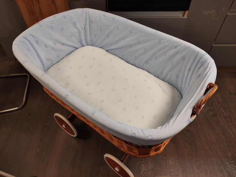 Košík pro miminko, na velkých kolečkách, prostorný, s matrací. Jen madlo košíku již moc nedrží, ale třeba někdo bude umět opravit. K tomu dále držák na nebesa a nebesa, viz https://www.nejbaby.cz/p/moskytiera-ke-kosi-a-kolebce/, dále pak dvě kompletní sady do koše, tj. polštářky, peřinky, povlečení, plachtičky, límce na košík a jeden chránič matrace. Jedna sada byla nedávno kupovaná nová (sovičky), ale na polštářku je drobná dírka (z výroby). Druhá - modrá - flíčky.