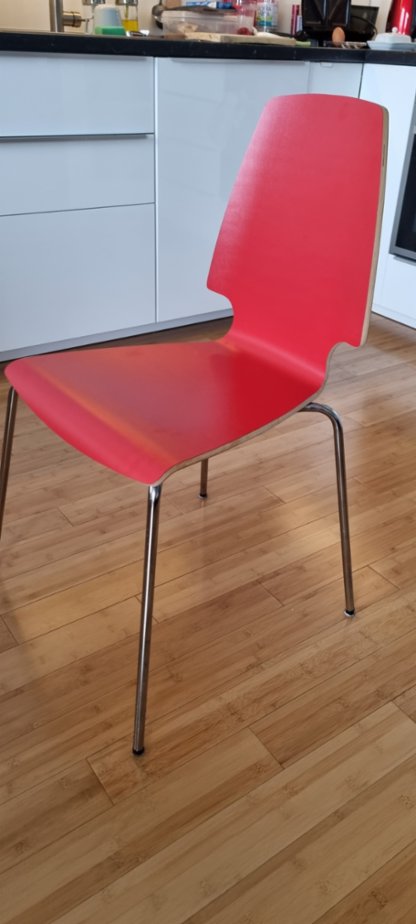 Přenechám za odvoz 3 kuchyňské židle. Materiál dřevo. Jedna lehce poškozená (viz foto), ale zcela funkční.