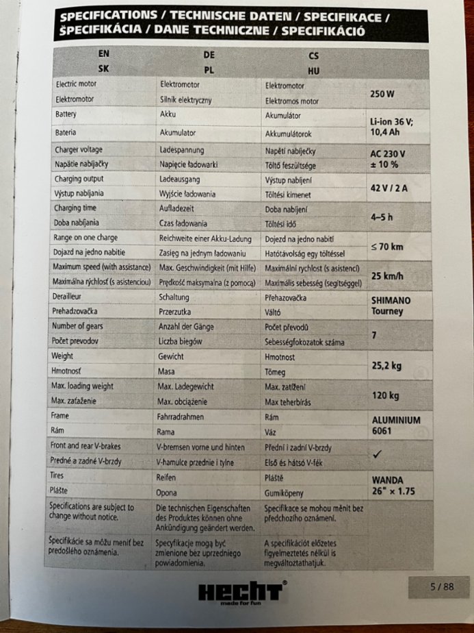 Prodám elektrokolo Hecht Prime, stáří 3 roky, téměř nejeté, jako nové. Spolehlivé kolo určené pro každodenní použití ve městě i na vesnici. Nízko položený rám umožní snadné nasedání i sesedání. Li-ion akumulátor 10,4 Ah napětí 36 V. Akumulátor plně nabitý s dodávanou nabíječkou (součást dodávky) přibližně za 5 hodin. Výkon motoru je 250 W. Maximální rychlost kola s asistencí je 25 km/hod. Cena 15.000 Kč.