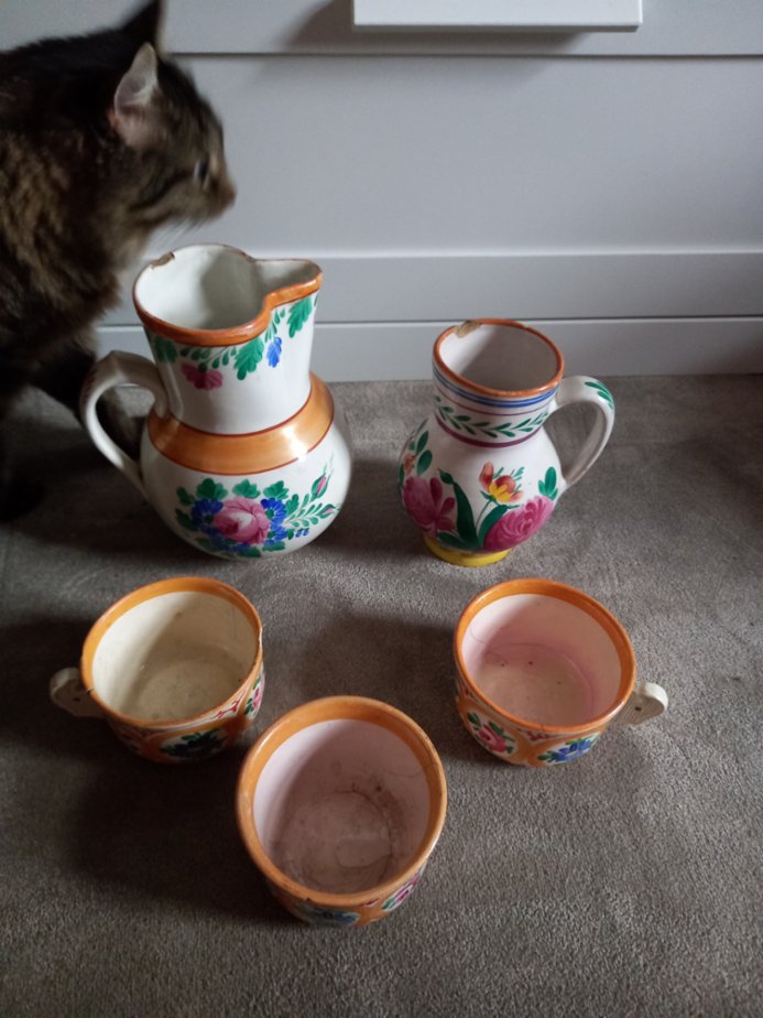 Nabízím k prodeji 5 ks Habánské keramiky. Výška džbánu je 22cm, po obvodě měří 52 cm.