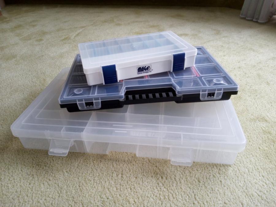 Nabízím plastové boxy na spojovací materiál. Tři různé velikosti. Malé (205x120x32mm) - 70ks (1500Kč) , střední (290x185x34mm) - 20ks (1000Kč) a velké (355x220x47mm) - 20ks (1200Kč). Nejlépe vše (3200Kč).