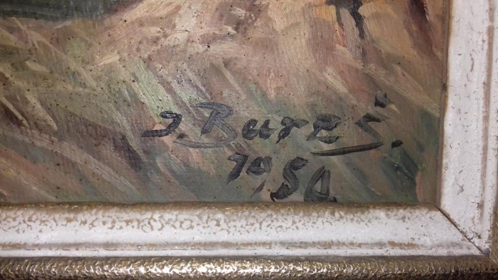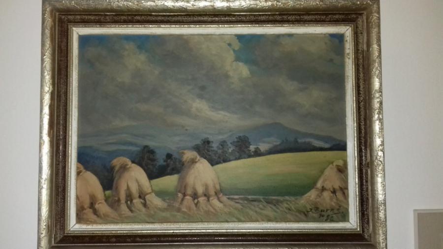 Prodám Bureš J.: "Žně před bouří na Železno Brodsku". Autorem je ceněný a vyhledávaný malíř. Velmi kvalitní, líbivé dílo. Rozměry 50x70 cm; včetně rámu 62x82 cm. Rám - staré zlato široké. Olej na lepence. Zezadu je uveden název díla, rok zhotovení malby a podpis autora - vše viz foto. Celkový stav - viz foto. Bude perlou Vaší sbírky a úžasnou dekorací větších prostor. Originalitu plně zaručuji. Cena dohodou.