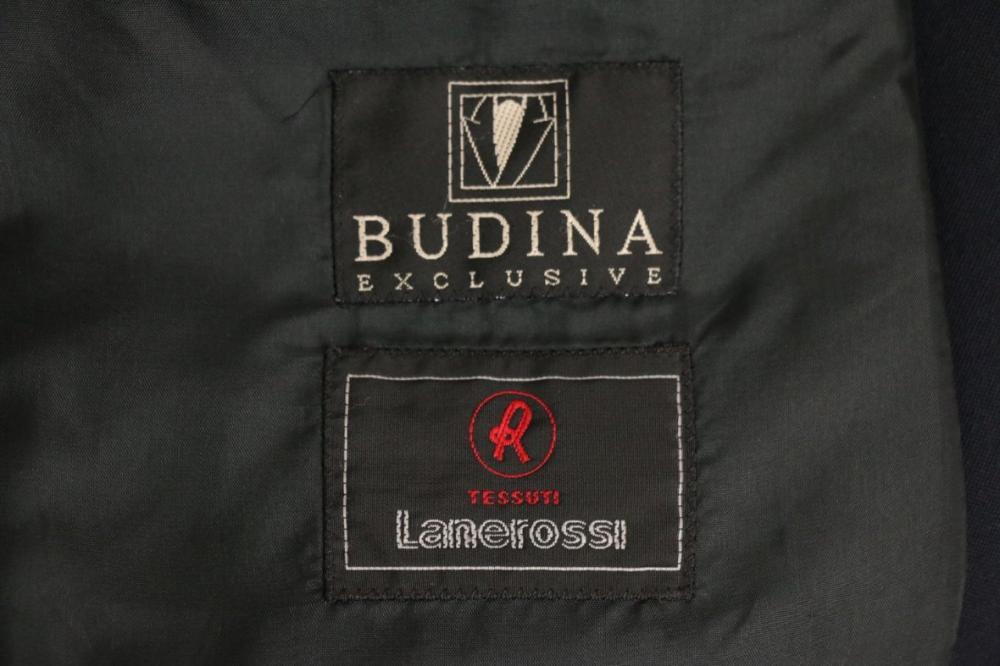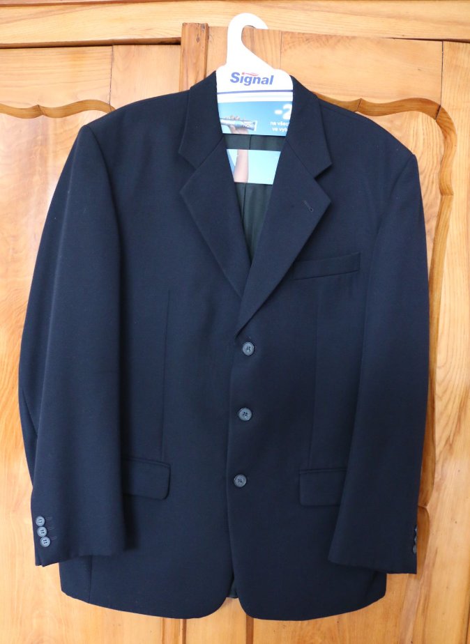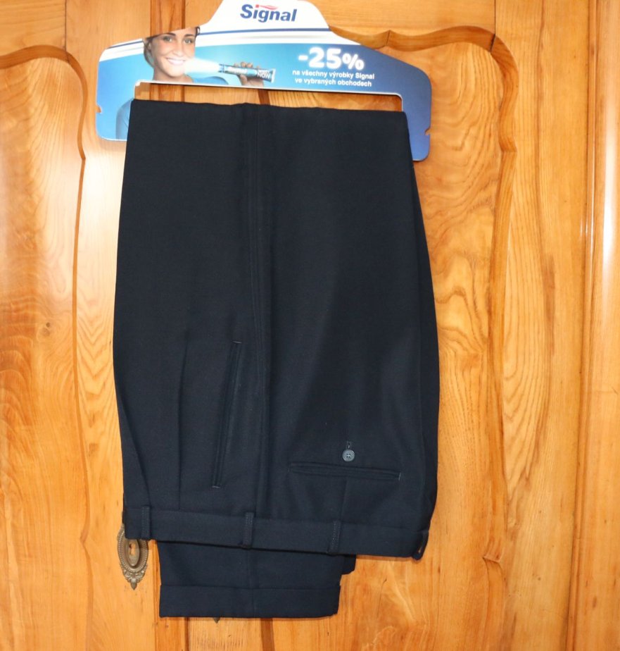Pánský jednořadový oblek značky Budina. Velikost 54. Barva tmavě modrá. Kalhoty s manžetou. Materiál 100% vlna. Sako: obvod hrudníku při zapnutém saku 125cm, obvod pasu 114cm, obvod boků 116cm, rameno 18cm, délka rukávu 65cm, šíře zad 50cm, délka saka 80cm. Kalhoty: obvod pasu 96cm, boční délka 110cm, vnitřní délka od rozkroku 81cm, dolní šíře nohavice 23cm. Oblek je po chemickém čištění v čistírně. Málo nošený. Cena 1.000 Kč.