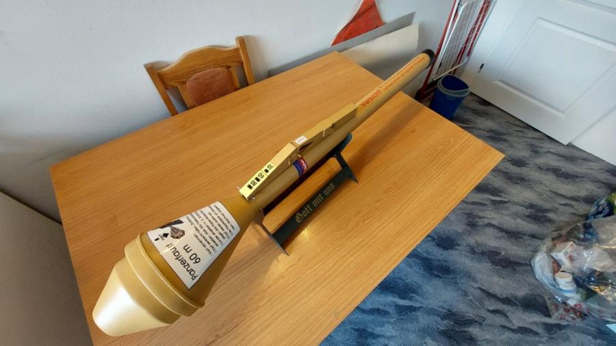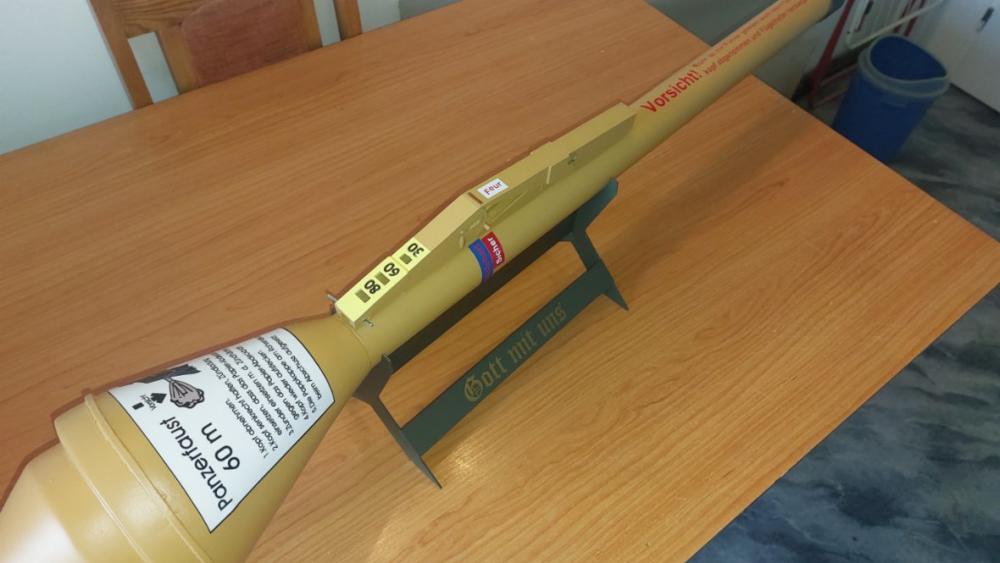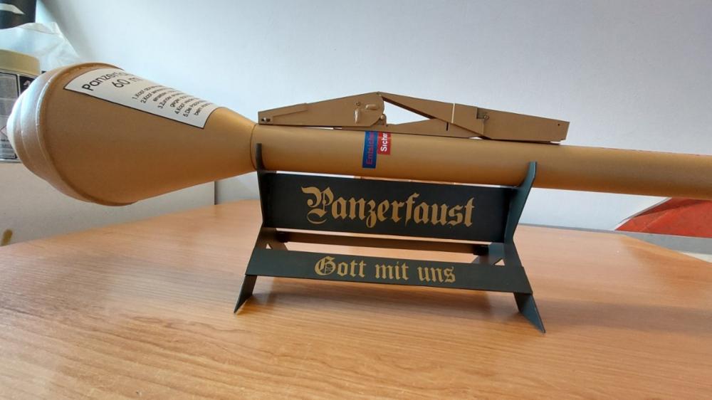 Replika Panzerfaustu + stojánek, vhodné jako dekorace na vojenskou techniku.