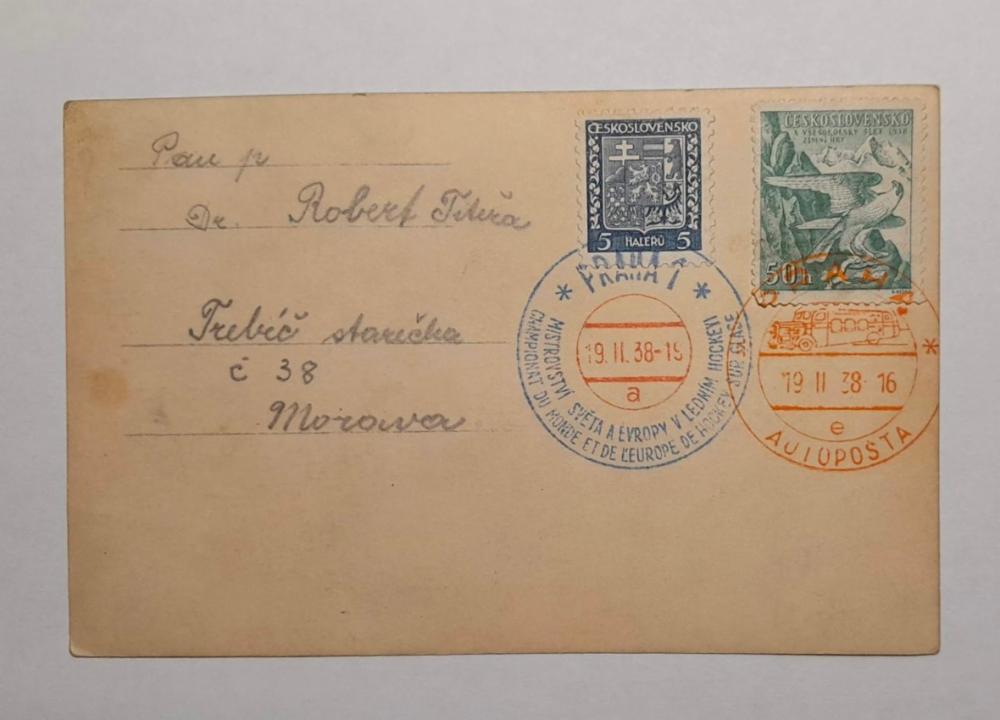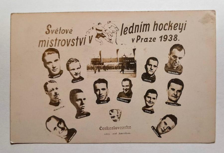 Nabízím historickou pohlednici "Světové mistrovství v ledním hockeyi v Praze 1938". Stav viz foto.