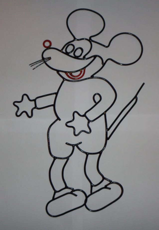 Postavička myšáka Mickey Mouse z drátu, vhodné na zeď apod., výška 40 cm, šířka v nejširším místě cca 26 cm, cena 80 Kč + přepravné.