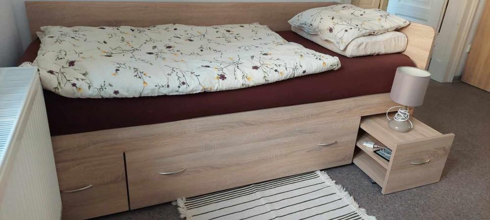 Postel s úložným prostorem a zasouvací nočním stolkem používaná cca 2 mesice