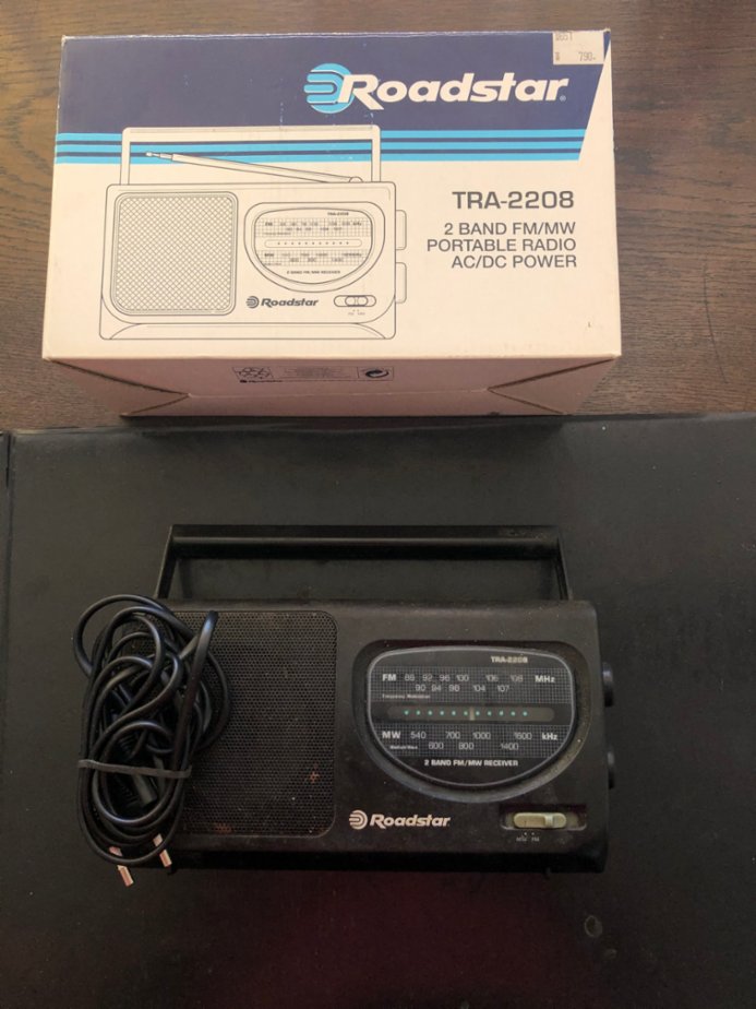 Přenosné, funkční, zachovalé radio Roadstar TRA-2208; 2 Band FM/MW. Portable radio; AC/DC Power. Černé, výška 12,5cm, šířka 22,5cm, hloubka 6,5cm. Frekvenční rozsah: SV (MW) 535-1610 kHz, VKV (FM) 87,5-108 MHz . Teleskopická anténa, držadlo, reproduktor. Konektor pro připojení sluchátek. Konektor pro připojení síťového kabelu. Síťový kabel. 4 tužkové baterie 1,5V . Praha. Cena dohodou.