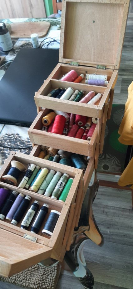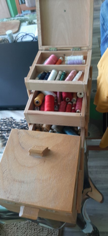 Skříňku na šití - plno nití, krabička se špendlíky. 400 Kč.