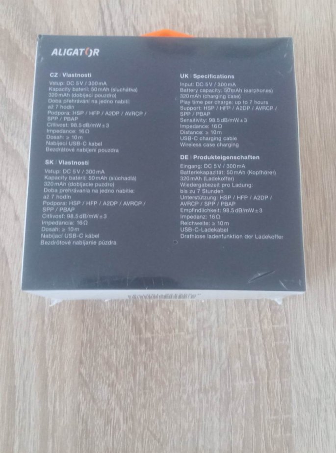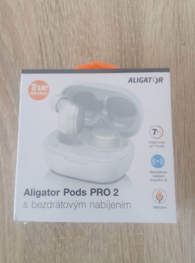 Zcela nová, nerozbalená - bezdrát. sluchátka Aligator Pods Pro 2 s bezdrátovým nabíjením, barvy bílá. Z důvodu dvojitého daru jedny nepotřebuji. Bluetooth verze: 5.1 . Vstup: DC 5V / 300mA . Kapacity baterií: 50mAh (sluchátka) 320mAh (dobíjecí pouzdro) Doba přehrávání na jedno nabití: až 7 hodin Doba přehrávání celkem: až 30 hodin . Podpora: HSP/HFP/A2DP/AVRCP/SPP/PBAP. Citlivost: 98.5 dB/mW ± 3. Impedance: 16Ω. Dosah: ≥10m . Nabíjecí USB-C kabel . Bezdrátové nabíjení pouzdra.