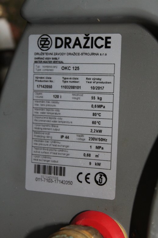 Boiler Dražice OKC125 kombi (možno ohřívat vodou z otopného okruhu, elektricky nebo obojím), výroba 10/2017. 4.000 Kč.