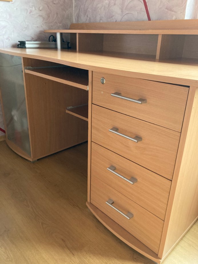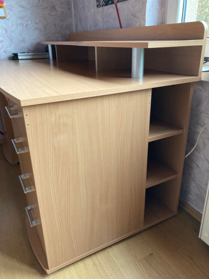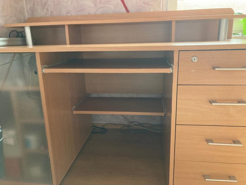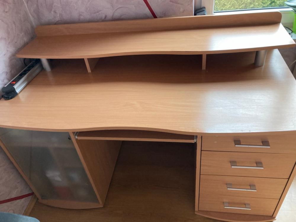 Psací stůl s úložnými přihrádkami. Vyroben v dekoru dub. Výsuv pro klávesnici, na tiskárnu a jiné… Používané, sloužící 3 roky, nezničený, připravený pro další zájemce do domácnosti. Širé plochy 75cm. Výška plochy 74cm + s poličkou 94cm . Délka plochy 150cm. Osobní odběr - při rychlém jednání sleva.