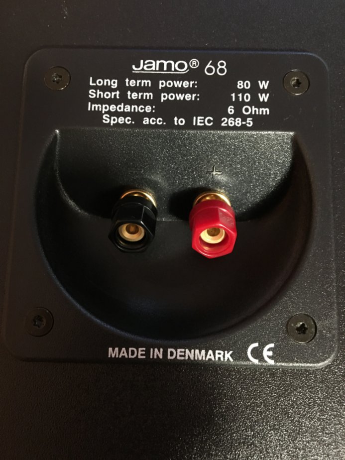 Dvě kvalitní reprobedny Jamo 68 z r. 97 . Třípásmové reprobedny s bas reflexem. Frekvenční rozsah 47 – 20 000 Hz. Citlivost 90 dB, impedance 6 Ohm. Výkon 80 W/110 W (long/short term power). Rozměry v x š x h 440 x 243 x 242 mm. Hmotnost 6kg.