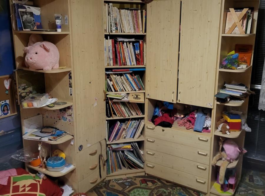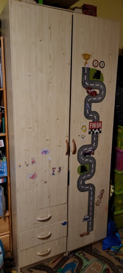 Prodám rohovou sestavu skříní do dětského pokoje . Materiál lamino dekor borovice. Lze mít jako jednu rohovou stěnu a nebo různě kombinovat. Rozměry: výška 210cm , hloubka 50cm , šířky - samostatná skříň na fotografii má šířku 90cm , rohová stěna má šířky skříní dle fotografie zleva 25-45-50-80-25cm . Cena za komplet je 2.000 Kč.