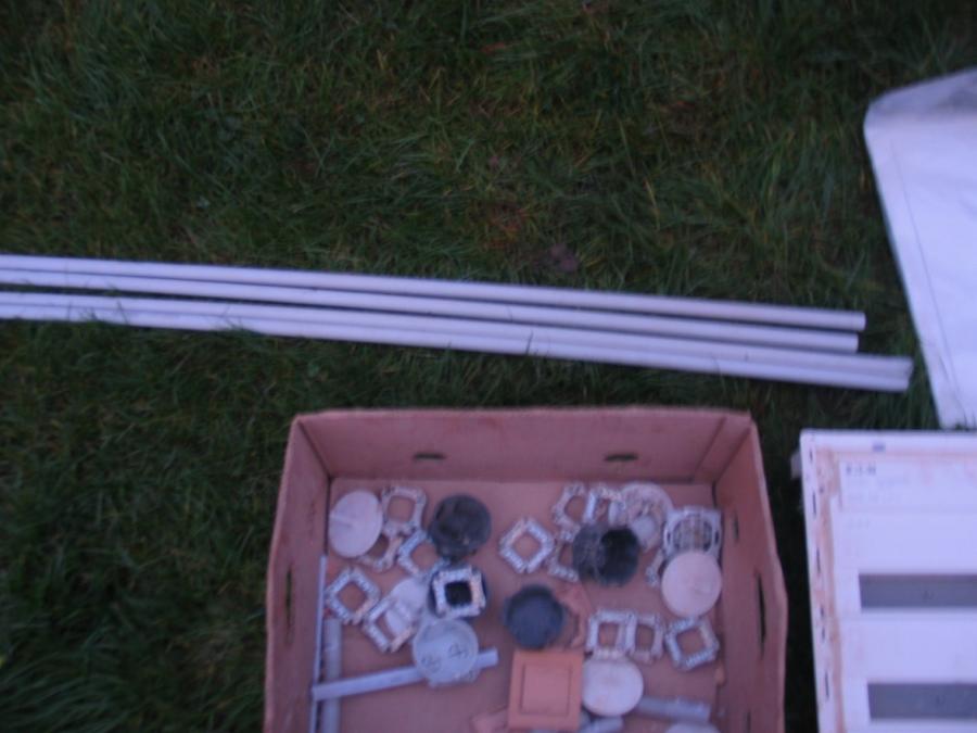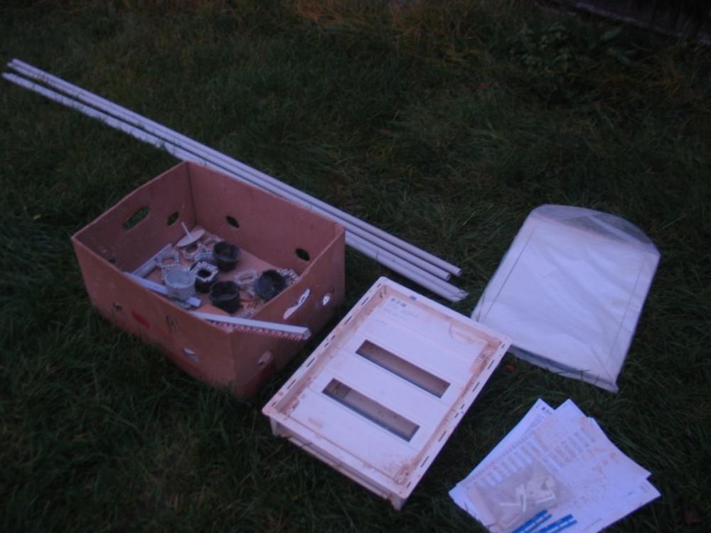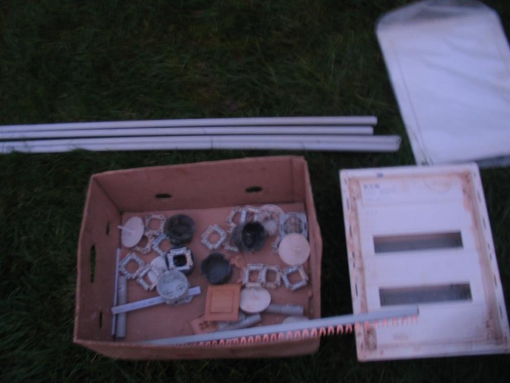 Rozvaděč na 24 pozic /plechová dvířka/, 2 vypínače - patina javor, věnečky, krabice, hřeben, 4 dvoumetrové roury na kabely. Všechno za 800 Kč. Volejte nebo pište.