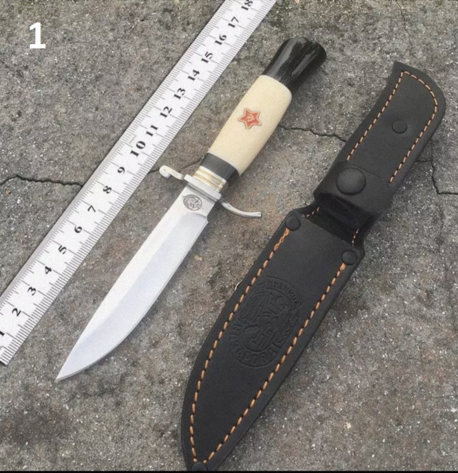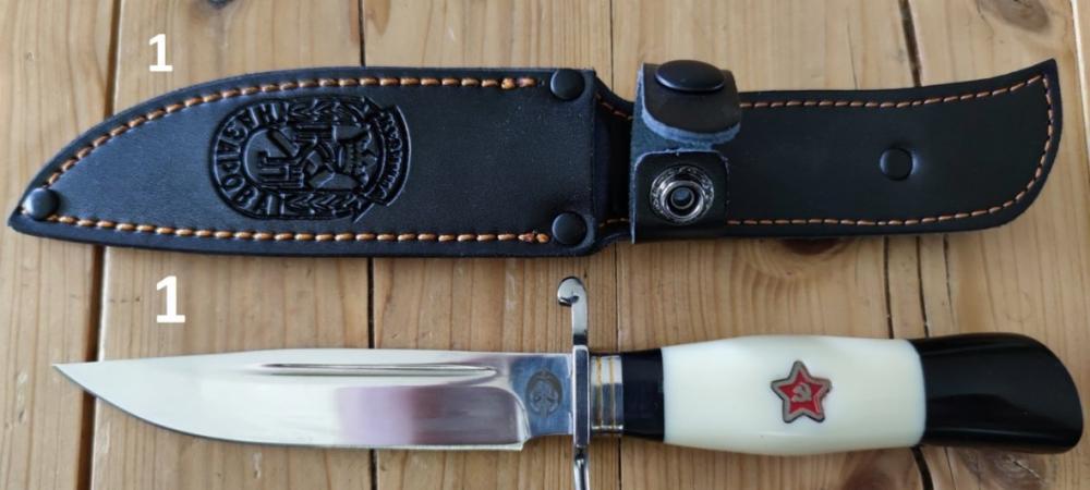 Ruský policejní nůž s pevnou čepelí finka NKVD, nerez ocel 440C, kožené pouzdro, celková délka 24,5 cm, ostří čepele 11,5 (13)cm, váha 160g, cena 1.800 Kč. 2. Ruský policejní zavírací nůž finka NKVD, KGB, milice, nerez ocel 440C, pouzdro. Zavřený 12 cm, otevřený 22 cm, ostří čepele 9,5 (9,7)cm, váha 132g, černý dřevěná střenka, světlý imitace slonoviny.