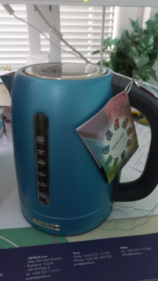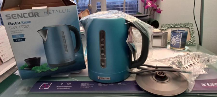 Prodám novou rychlovarnou konvici - nerezová, objem 1,7 l, modrá metalická barva, příkon 2150 W, filtr, kontrolka provozu, otočná základna a skrytá spirála, automatické vypnutí, ochrana proti přehřátí, ukazatel vodní hladiny, vyjímatelný filtr, vysoký příkon, rychlá, úsporná. Má ergonomickou rukojeť pro dobré uchycení a 360° STRIX konektor. Zcela nová, nepoužitá, originál balení, nevhodný dárek