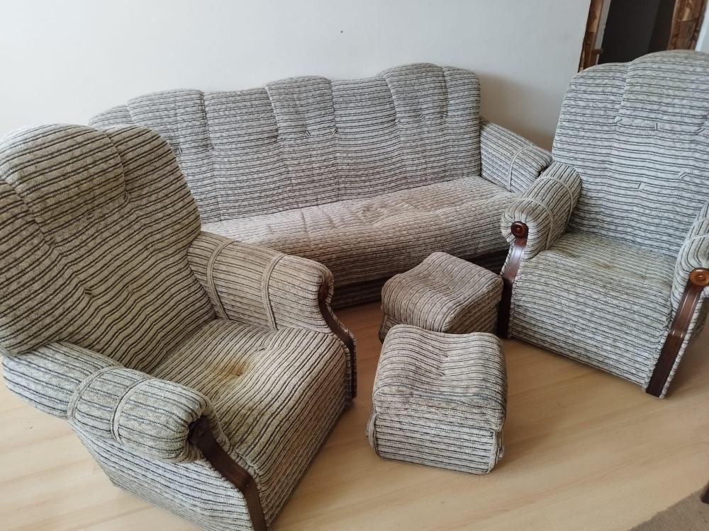 Sedací souprava. Rozkládací pohovka, 2 křesla, 2 taburetky, potah - látkový - šedý melír.