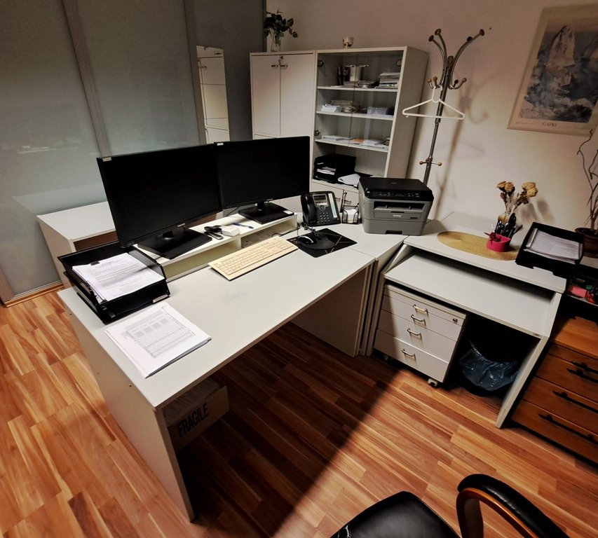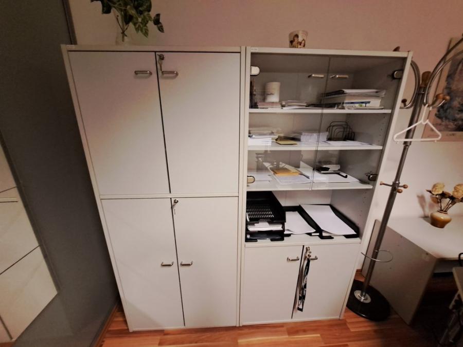 Prodáme sestavu nábytku do kanceláře. Zachovalý stav, barva světle šedá - stůl, tři odkládací stoly, kontejner, skříňky. Termín do 20.1.2023.