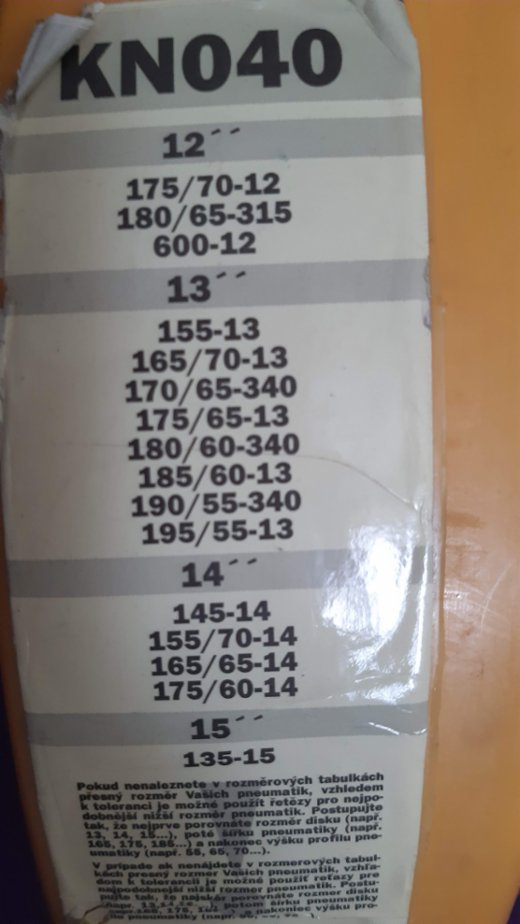 Nabízím sněhové řetězy Filson Comfort KN 040, snadné použití na R 13 až 15, viz rozměry v tabulce-foto.